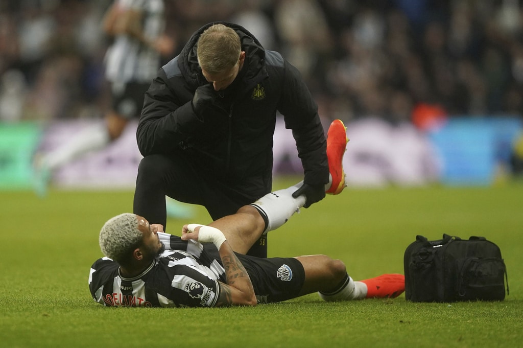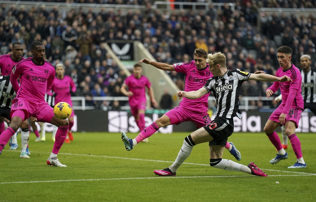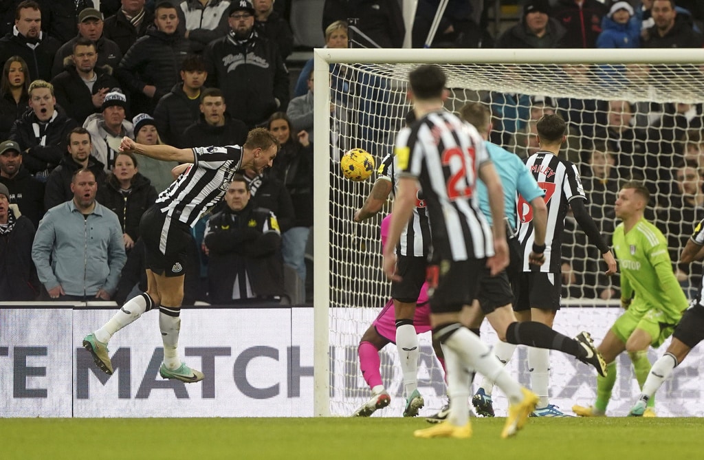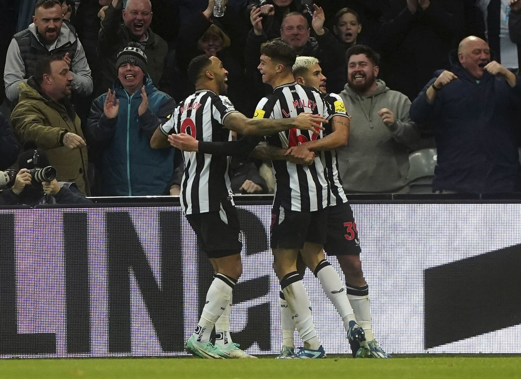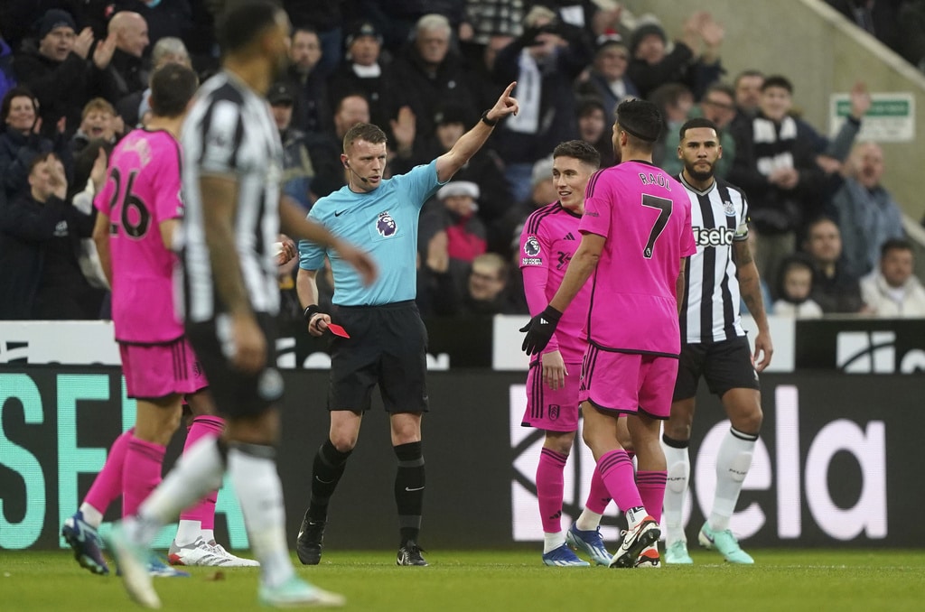Fulham’s Raul Jimenez is shown a red card, during the English Premier League soccer match between Newcastle United and Fulham, at St. James’ Park, in Newcastle upon Tyne, England, Saturday, Dec. 16, 2023. (Owen Humphreys/PA via AP)Newcastle United’s Dan Burn scores his side’s third goal of the game, during the English Premier League soccer match between Newcastle United and Fulham, at St. James’ Park, in Newcastle upon Tyne, England, Saturday, Dec. 16, 2023. (Owen Humphreys/PA via AP)Newcastle United’s Lewis Miley, centre, celebrates scoring his side’s first goal of the game, during the English Premier League soccer match between Newcastle United and Fulham, at St. James’ Park, in Newcastle upon Tyne, England, Saturday, Dec. 16, 2023. (Owen Humphreys/PA via AP)Newcastle United’s Lewis Miley scores his side’s first goal of the game, during the English Premier League soccer match between Newcastle United and Fulham, at St. James’ Park, in Newcastle upon Tyne, England, Saturday, Dec. 16, 2023. (Owen Humphreys/PA via AP)Newcastle United’s Joelinton receives treatment, during the English Premier League soccer match between Newcastle United and Fulham, at St. James’ Park, in Newcastle upon Tyne, England, Saturday, Dec. 16, 2023. (Owen Humphreys/PA via AP)Newcastle United’s Anthony Gordon shoots and hits the crossbar, during the English Premier League soccer match between Newcastle United and Fulham, at St. James’ Park, in Newcastle upon Tyne, England, Saturday, Dec. 16, 2023. (Owen Humphreys/PA via AP)