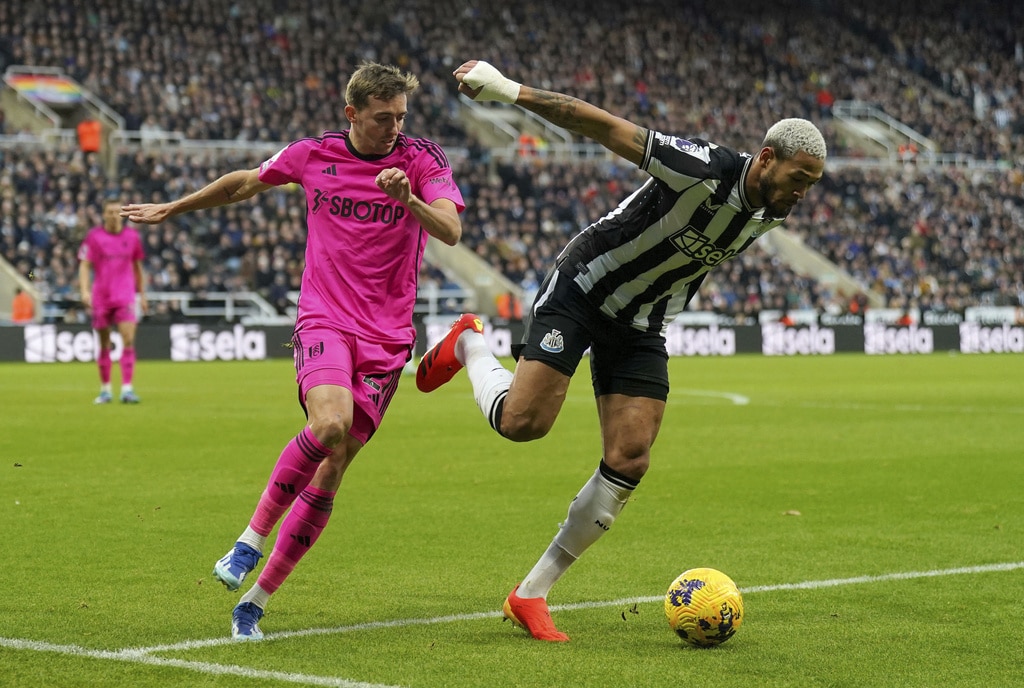 Fulham’s Timothy Castagne, left and Newcastle United’s Joelinton vie for the ball, during the English Premier League soccer match between Newcastle United and Fulham, at St. James’ Park, in Newcastle upon Tyne, England, Saturday, Dec. 16, 2023. (Owen Humphreys/PA via AP)