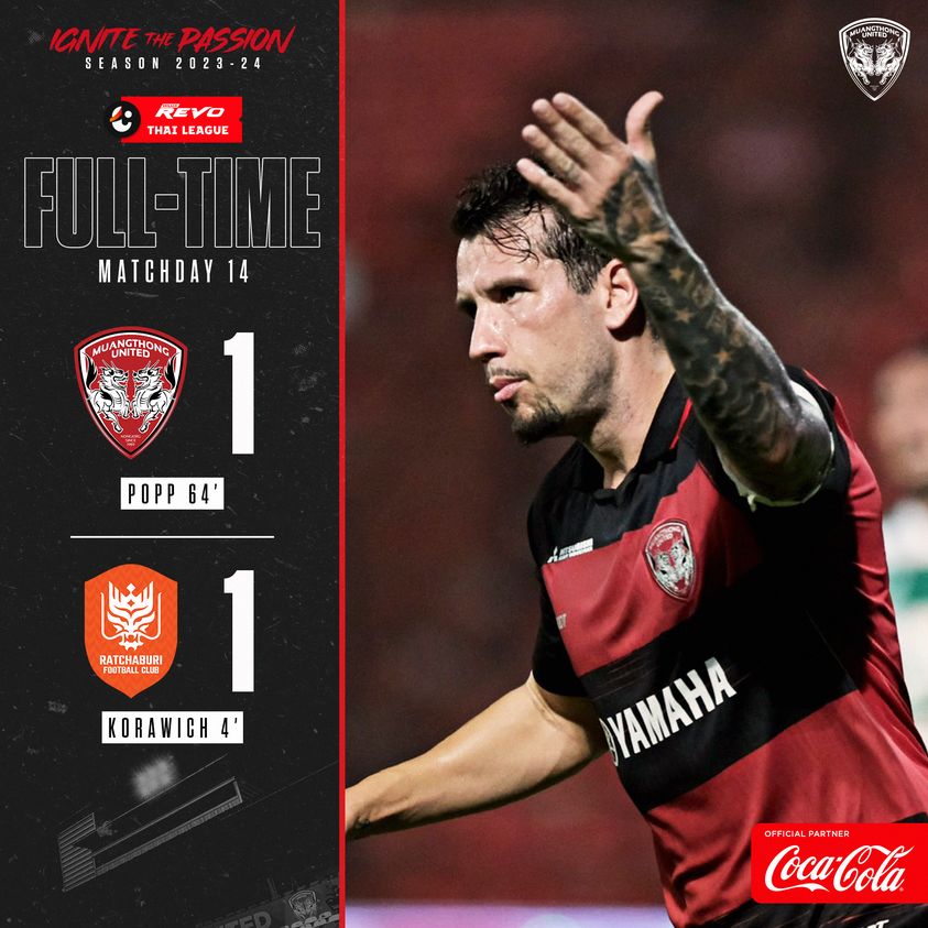 ผลการแข่งขันปรากฏว่า เจ้าบ้านได้ วิลเลี่ยน พอพพ์ ที่ฟอร์มฮอตต่อเนื่องซัด 2 นัดติด ช่วยพา เมืองทอง ยูไนเต็ด ไล่ตีเสมอ ราชบุรี เอฟซี 1-1 จบเกมทำให้ “กิเลนผยอง” มี 18 คะแนน รั้งอันดับ 7 ของตาราง ขณะที่ “ราชันมังกร” มี 16 แต้ม อยู่ที่ 9 ตารางลีก