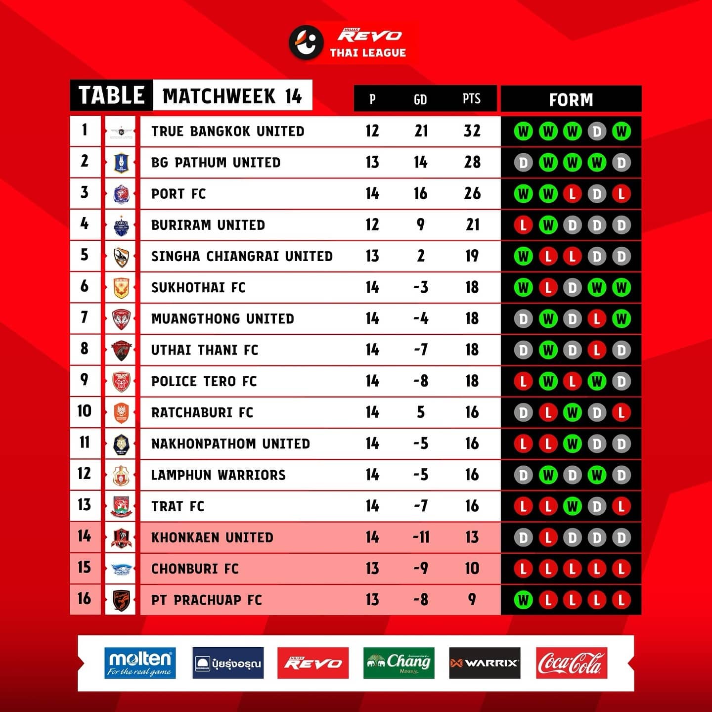 สรุปผลการแข่งขัน รีโว่ ไทยลีก 2023/24 หลังจบนัดที่ 14