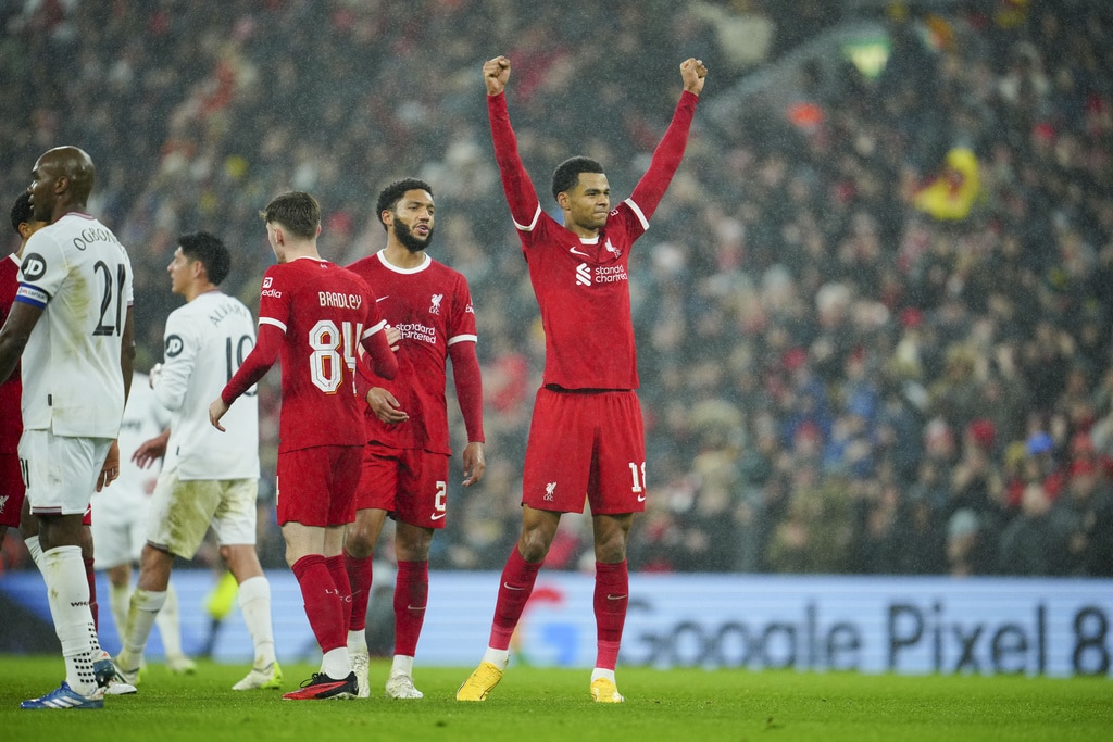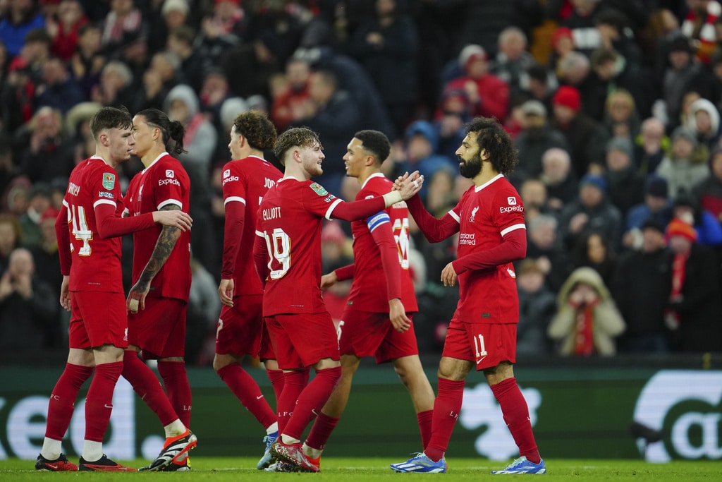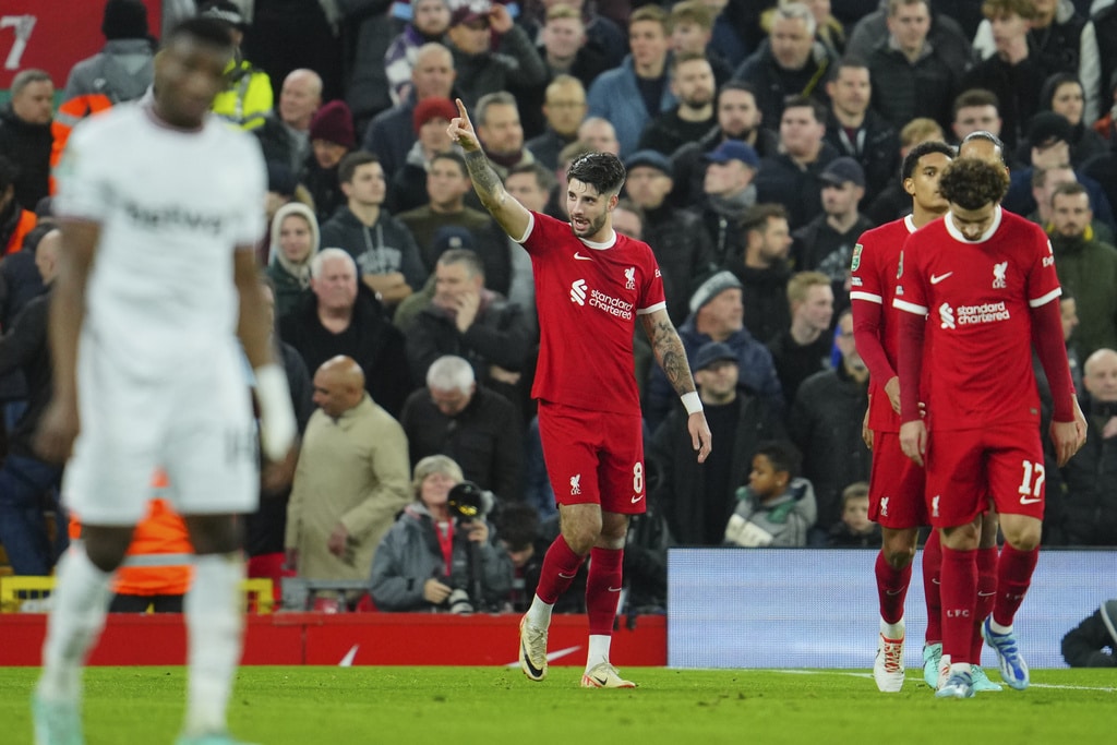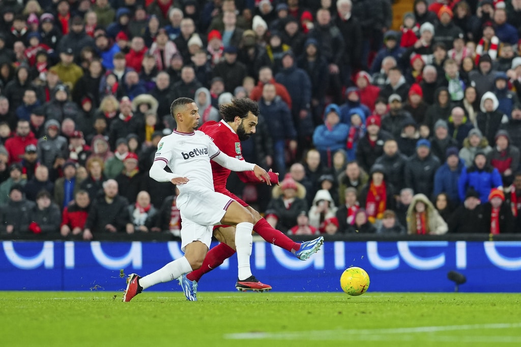 Liverpool’s Dominik Szoboszlai, center, celebrates scoring his side’s opening goal during the English League Cup quarterfinal soccer match between Liverpool and West Ham United at the Anfield stadium in Liverpool, England, Wednesday, Dec. 20, 2023. (AP Photo/Jon Super)Liverpool’s Jarell Quansah, center, applauds the crowd after the English League Cup quarterfinal soccer match between Liverpool and West Ham United at the Anfield stadium in Liverpool, England, Wednesday, Dec. 20, 2023. Liverpool won 5-1. (AP Photo/Jon Super)Liverpool’s Mohamed Salah goes for the ball during the English League Cup quarterfinal soccer match between Liverpool and West Ham United at the Anfield stadium in Liverpool, England, Wednesday, Dec. 20, 2023. (AP Photo/Jon Super)Liverpool’s Curtis Jones celebrates scoring his side’s 5th goal during the English League Cup quarterfinal soccer match between Liverpool and West Ham United at the Anfield stadium in Liverpool, England, Wednesday, Dec. 20, 2023. (AP Photo/Jon Super)Liverpool’s Mohamed Salah, back, scores his side’s 4th goal during the English League Cup quarterfinal soccer match between Liverpool and West Ham United at the Anfield stadium in Liverpool, England, Wednesday, Dec. 20, 2023. (AP Photo/Jon Super)Liverpool’s Cody Gakpo applauds as he is substituted during the English League Cup quarterfinal soccer match between Liverpool and West Ham United at the Anfield stadium in Liverpool, England, Wednesday, Dec. 20, 2023. (AP Photo/Jon Super)Liverpool’s Cody Gakpo, front, is congratulated after scoring his side’s 3rd goal during the English League Cup quarterfinal soccer match between Liverpool and West Ham United at the Anfield stadium in Liverpool, England, Wednesday, Dec. 20, 2023. (AP Photo/Jon Super)Liverpool’s Cody Gakpo, center, celebrates scoring his side’s 3rd goal during the English League Cup quarterfinal soccer match between Liverpool and West Ham United at the Anfield stadium in Liverpool, England, Wednesday, Dec. 20, 2023. (AP Photo/Jon Super)Liverpool’s Curtis Jones, left, challenges West Ham’s Jarrod Bowen during the English League Cup quarterfinal soccer match between Liverpool and West Ham United at the Anfield stadium in Liverpool, England, Wednesday, Dec. 20, 2023. (AP Photo/Jon Super)West Ham’s Jarrod Bowen, right, dribbles the ball followed by Liverpool’s Wataru Endo during the English League Cup quarterfinal soccer match between Liverpool and West Ham United at the Anfield stadium in Liverpool, England, Wednesday, Dec. 20, 2023. (AP Photo/Jon Super)Liverpool’s Kostas Tsimikas, left, and West Ham’s Vladimir Coufal jumps for the ball during the English League Cup quarterfinal soccer match between Liverpool and West Ham United at the Anfield stadium in Liverpool, England, Wednesday, Dec. 20, 2023. (AP Photo/Jon Super)