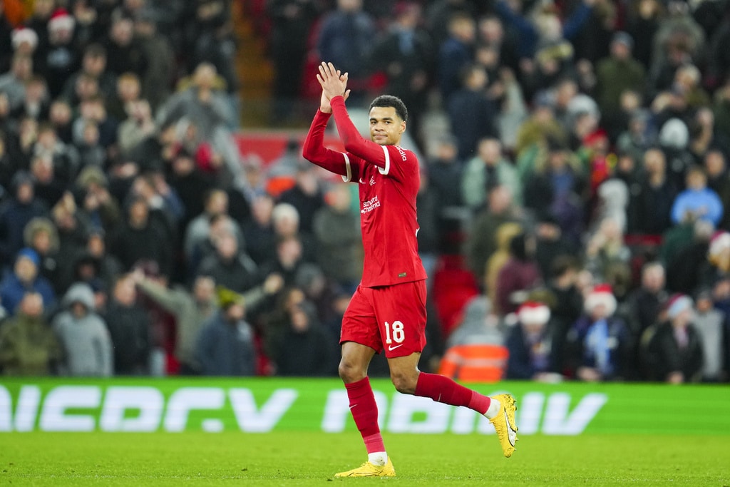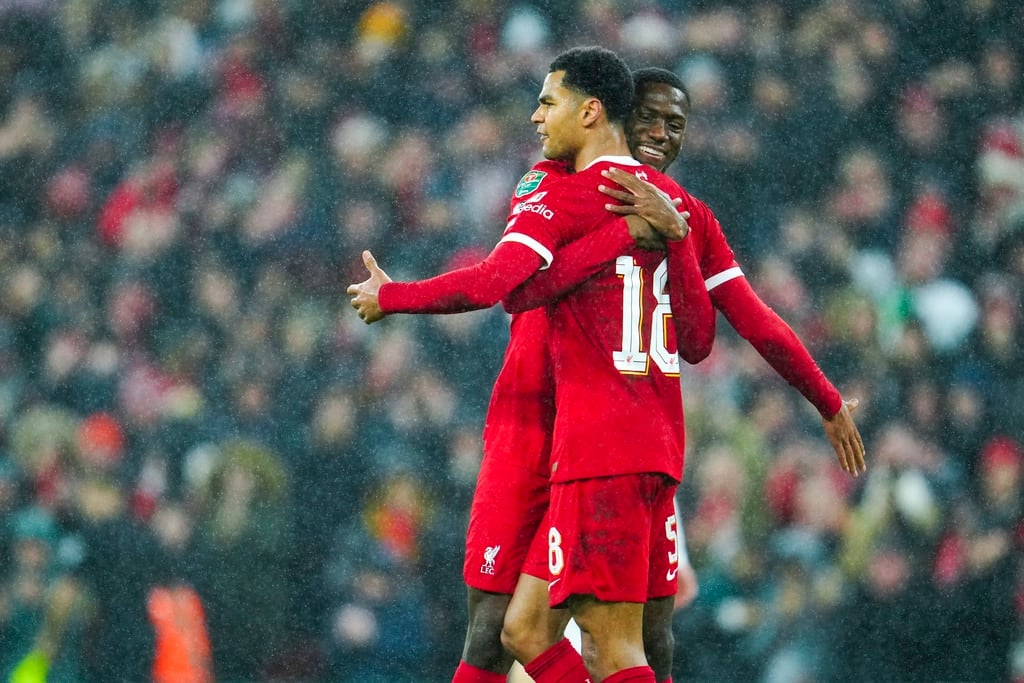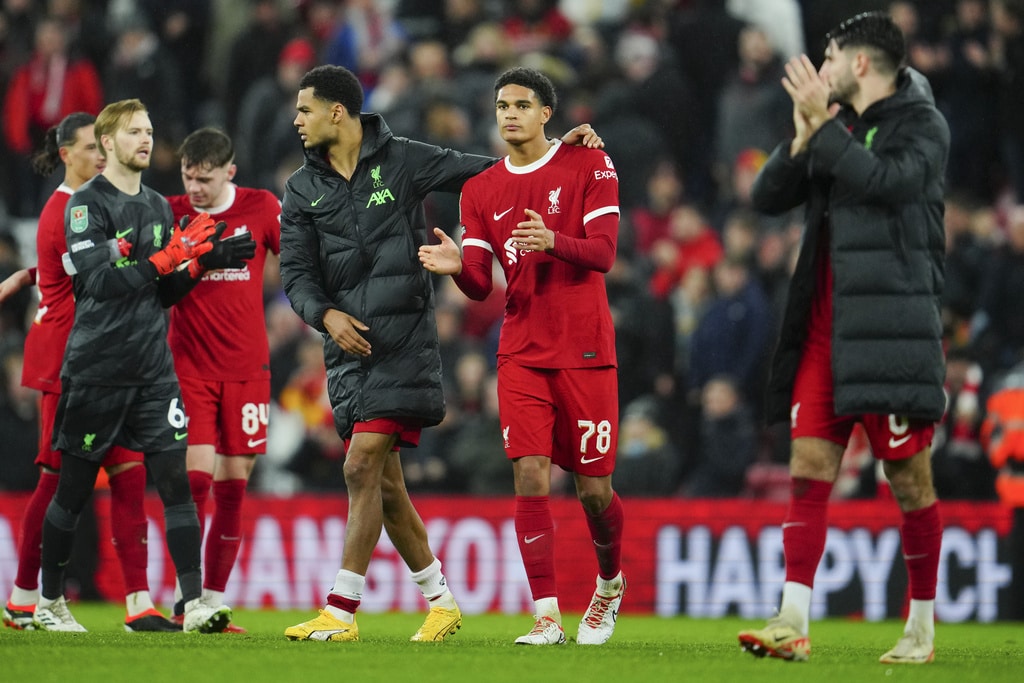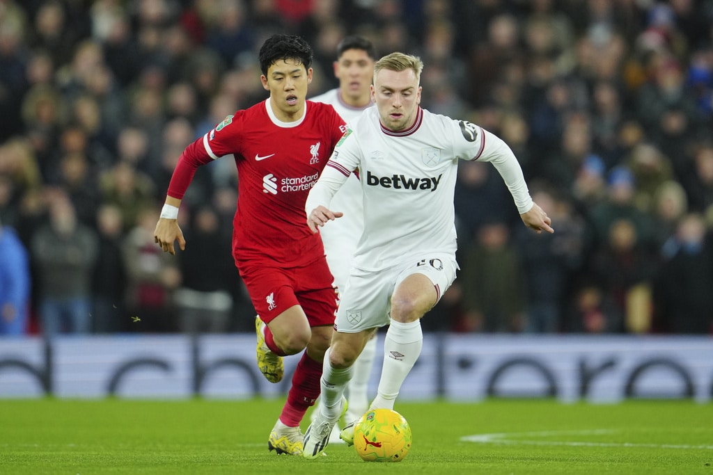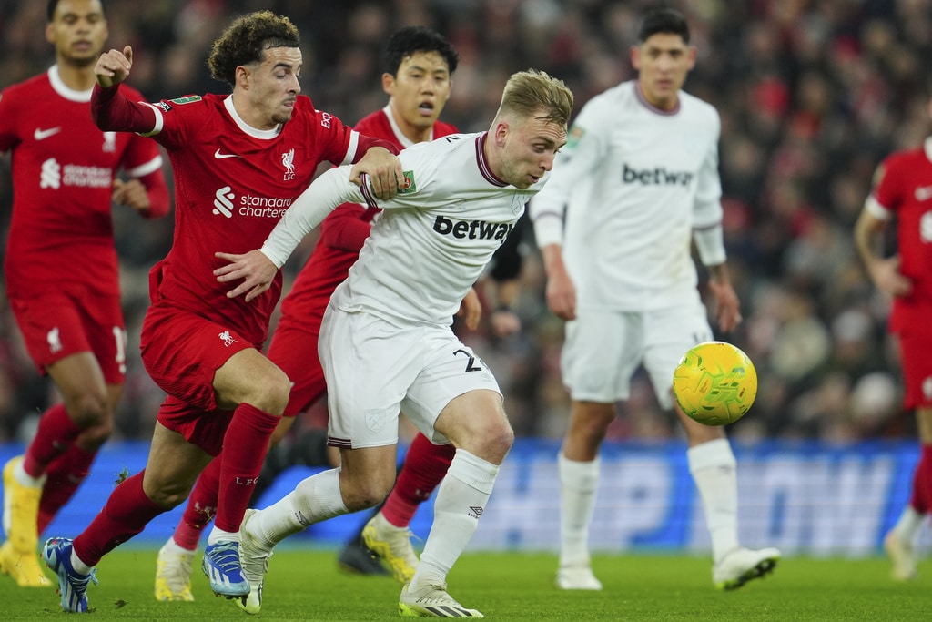 Liverpool’s Dominik Szoboszlai, center, celebrates scoring his side’s opening goal during the English League Cup quarterfinal soccer match between Liverpool and West Ham United at the Anfield stadium in Liverpool, England, Wednesday, Dec. 20, 2023. (AP Photo/Jon Super)Liverpool’s Jarell Quansah, center, applauds the crowd after the English League Cup quarterfinal soccer match between Liverpool and West Ham United at the Anfield stadium in Liverpool, England, Wednesday, Dec. 20, 2023. Liverpool won 5-1. (AP Photo/Jon Super)Liverpool’s Mohamed Salah goes for the ball during the English League Cup quarterfinal soccer match between Liverpool and West Ham United at the Anfield stadium in Liverpool, England, Wednesday, Dec. 20, 2023. (AP Photo/Jon Super)Liverpool’s Curtis Jones celebrates scoring his side’s 5th goal during the English League Cup quarterfinal soccer match between Liverpool and West Ham United at the Anfield stadium in Liverpool, England, Wednesday, Dec. 20, 2023. (AP Photo/Jon Super)Liverpool’s Mohamed Salah, back, scores his side’s 4th goal during the English League Cup quarterfinal soccer match between Liverpool and West Ham United at the Anfield stadium in Liverpool, England, Wednesday, Dec. 20, 2023. (AP Photo/Jon Super)Liverpool’s Cody Gakpo applauds as he is substituted during the English League Cup quarterfinal soccer match between Liverpool and West Ham United at the Anfield stadium in Liverpool, England, Wednesday, Dec. 20, 2023. (AP Photo/Jon Super)Liverpool’s Cody Gakpo, front, is congratulated after scoring his side’s 3rd goal during the English League Cup quarterfinal soccer match between Liverpool and West Ham United at the Anfield stadium in Liverpool, England, Wednesday, Dec. 20, 2023. (AP Photo/Jon Super)Liverpool’s Cody Gakpo, center, celebrates scoring his side’s 3rd goal during the English League Cup quarterfinal soccer match between Liverpool and West Ham United at the Anfield stadium in Liverpool, England, Wednesday, Dec. 20, 2023. (AP Photo/Jon Super)Liverpool’s Curtis Jones, left, challenges West Ham’s Jarrod Bowen during the English League Cup quarterfinal soccer match between Liverpool and West Ham United at the Anfield stadium in Liverpool, England, Wednesday, Dec. 20, 2023. (AP Photo/Jon Super)West Ham’s Jarrod Bowen, right, dribbles the ball followed by Liverpool’s Wataru Endo during the English League Cup quarterfinal soccer match between Liverpool and West Ham United at the Anfield stadium in Liverpool, England, Wednesday, Dec. 20, 2023. (AP Photo/Jon Super)Liverpool’s Kostas Tsimikas, left, and West Ham’s Vladimir Coufal jumps for the ball during the English League Cup quarterfinal soccer match between Liverpool and West Ham United at the Anfield stadium in Liverpool, England, Wednesday, Dec. 20, 2023. (AP Photo/Jon Super)
