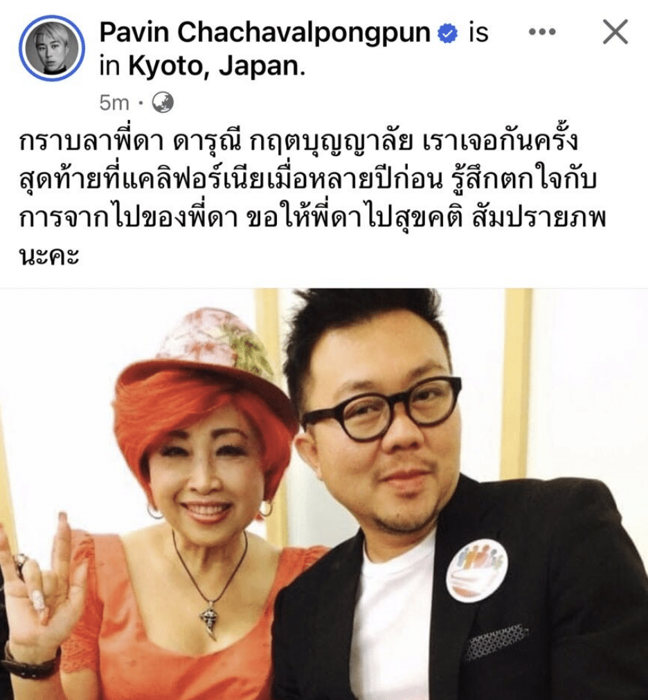 ส่วนอาจารย์ปวิน ชัชวาลพงศ์พันธ์ ได้โพสต์ข้อความว่า กราบลาพี่ดาร ดารุณี กฤตบุญญาลัย เราเจอกันครั้งสุดท้ายที่แคลิฟอร์เนียเมื่อหลายปีก่อน รู้สึกตกใจกับการจากไปของพี่ดา ขอให้พี่ดาไปสุขคติ สัมปรายภพนะคะ”