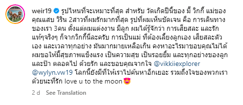 ข้อความจากคุณพ่อเวียร์ถึงคุณแม่วิกกี้นั้นหวานซึ้งเรียกน้ำตาคนอ่านสุด ๆ หลังเผยแพร่โพสต์ดังกล่าวบรรดาแฟน ๆ ก็ได้เข้ามาแสดงความคิดเห็นอวยพรวันเกิดให้กับคุณแม่คนเก่งกันจากล้นหลาม อาทิในข้อความที่ว่า
