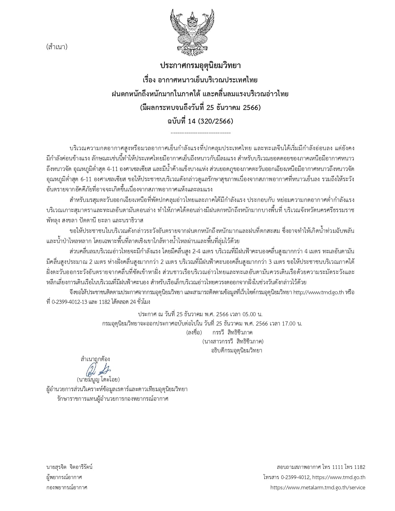 ประกาศ ณ วันที่ 25 ธันวาคม พ.ศ. 2566 เวลา 05.00 น. กรมอุตุนิยมวิทยาจะออกประกาศฉบับต่อไปใน วันที่ 25 ธันวาคม พ.ศ. 2566 เวลา 17.00 น. (ลงชื่อ) กรรวี สิทธิชีวภาค