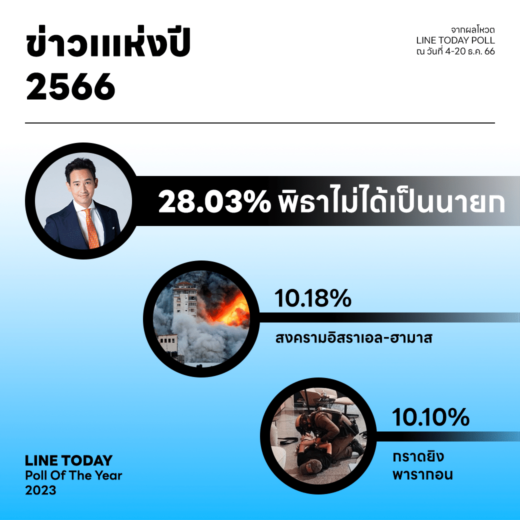 - “ข่าวแห่งปี 2023” – ตกเป็นของข่าว “ข่าวพิธาถือหุ้น ITV หลุดตำแหน่งนายกฯ” และโดนสั่งยุติการปฏิบัติหน้าที่ หลังจากชนะเลือกตั้งปี 66 ที่ผ่านมา ด้วยผลโหวต 28.03% รองลงมาเป็นข่าวสงครามระหว่างอิสราเอลและกลุ่มฮามาส 10.18% และอันดับสาม ข่าวเยาวชนวัย 14 กราดยิงศูนย์การค้า 10.1%