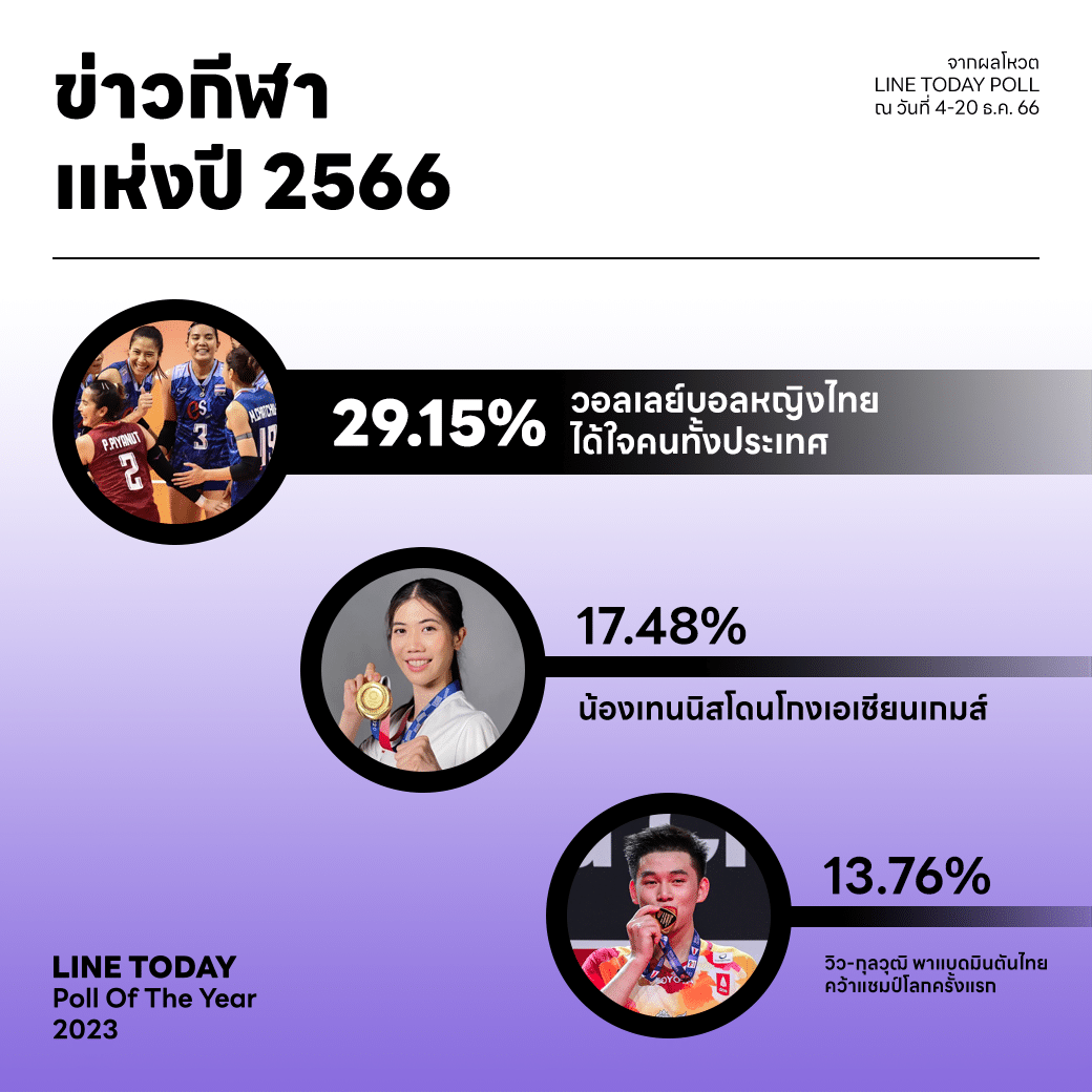 - “ข่าวกีฬา” แห่งปี – ได้แก่ ข่าวปีทองวอลเลย์บอลหญิงไทย ที่สร้างชื่อเสียงและความสำเร็จในเวทีการแข่งขันระดับนานาชาติหลายรายการ อาทิ เหรียญทองกีฬาซีเกมส์ 2023, แชมป์เอเชีย 2023 สมัยที่ 3 และเหรียญทองแดงเอเชียนเกมส์ จนได้รับการโหวตให้เป็นที่สุดแห่งปีด้านเหตุการณ์ข่าวกีฬาถึง 29.15% รองลงมาเป็นเหตุการณ์ชวนลุ้นเพราะคะแนนคู่แข่งขึ้นผิดปกติจากระบบผิดพลาด ทำเอานัก