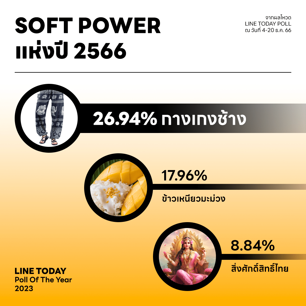 จากกระแสนโยบายการผลักดันซอฟต์ พาวเวอร์ (Soft Power) ที่เข้มข้น ทำให้กางเกงลายช้างกลายเป็นซอฟต์ พาวเวอร์ไทยที่มาแรงที่สุดแห่งปี ด้วยผลโหวตกว่า 26.94% ขณะที่ข้าวเหนียวมะม่วงยังคงได้รับอิทธิพลอย่างต่อเนื่องกว่า 17.96% ส่วนสิ่งศักดิ์สิทธิ์ไทย โดยเฉพาะพระพรหมและพระแม่ลักษมีก็ได้รับการโหวตให้เป็นหนึ่งในซอฟต์ พาวเวอร์มาแรงถึง 8.84%