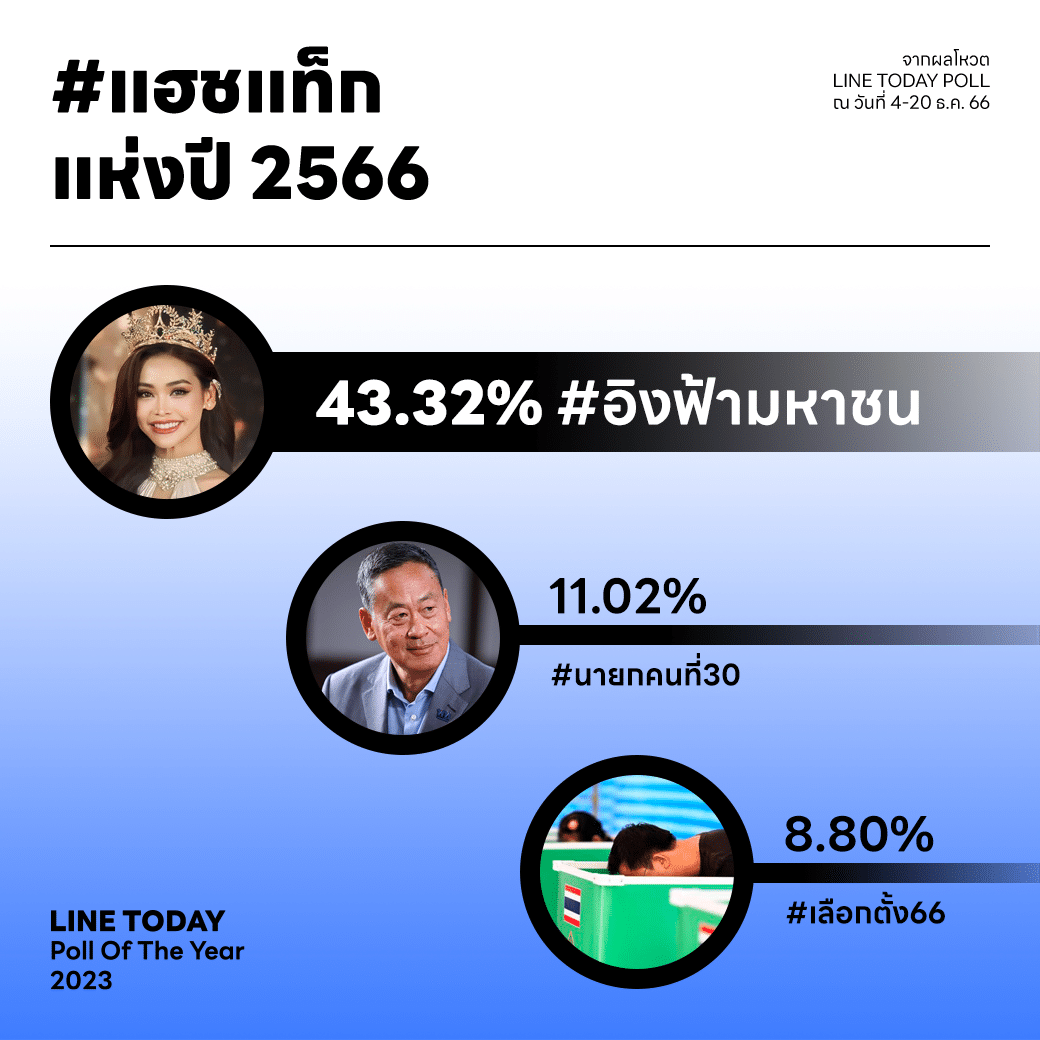นอกจากคอมมูนิตี้นางงามที่เติบโตไม่มีแผ่วในช่วง 2-3 ปีหลังมานี้ ยังพบว่า #อิงฟ้ามหาชน ของด้อมอิงฟ้า วราหะ ยังเป็นถูกโหวตให้เป็นแฮชแท็กแห่งปีด้วยคะแนนนำโด่งถึง 43.32% จากแรงเชียร์และแรงสนับสนุนที่เหนียวแน่น ตามมาด้วยอันดับ 2 อย่าง #นายกคนที่30 ที่ 11.02% จากสถานการณ์เลือกตั้งปี 66 ที่คึกคักนานหลายเดือน ตามมาอันดับ 3 ด้วย #เลือกตั้ง66 ที่ 8.80%