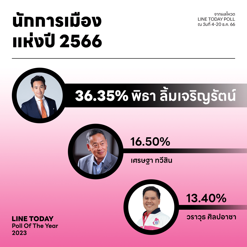 - “นักการเมือง” แห่งปี – ได้แก่ พิธา ลิ้มเจริญรัตน์ ได้รับการโหวตจากผู้ใช้ LINE TODAY ขึ้นแท่นที่สุดนักการเมืองแห่งปีที่ 36.35% อันดับ 2 เศรษฐา ทวีสิน 16.5% และอันดับ 3 วราวุธ ศิลปอาชา 13.4%