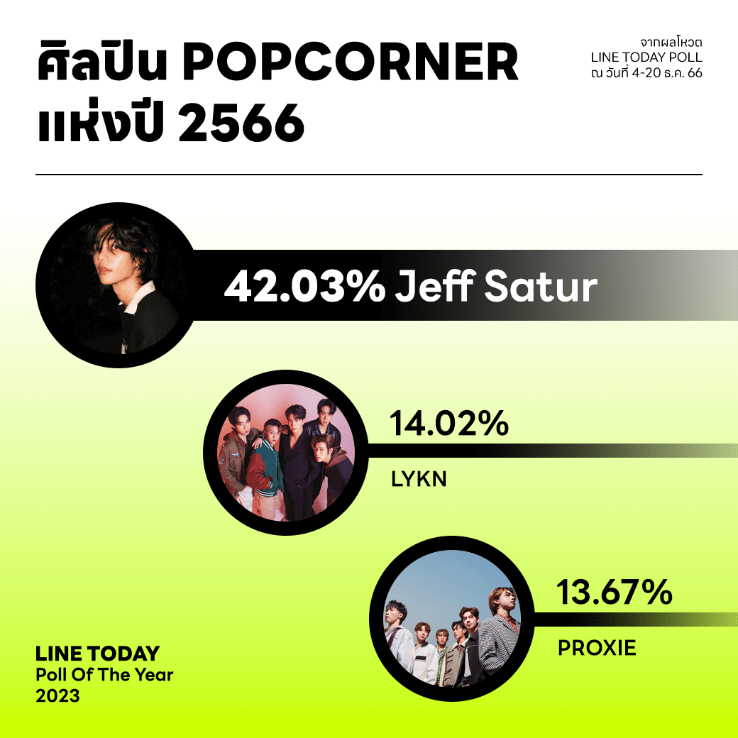 เจฟ ซาเตอร์ นักร้องหนุ่มสุดฮอต ที่เคยมาเล่าเรื่องราวและเช็กอินในรายการ “POPCORNER” บน LINE TODAY ติดอันดับหนึ่งศิลปินสุดเลิฟที่ชาวด้อมเทคะแนนโหวตให้มากที่สุด 42.03% รองลงมาเป็น ไลแคน (LYKN) วงบอยแบนด์ T-POP หน้าใหม่มาแรง 14.02% และตามมาติด ๆ กับอีกหนึ่งวงบอยแบนด์ไทยสุดฮอต พร็อกซี (PROXIE) เจ้าของเพลงฮิต “คนไม่คุย” 13.67%