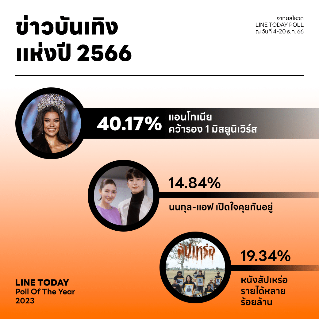 ปี 2023 ถือเป็นอีกปีที่วงการบันเทิงคึกคักไม่แพ้ปีไหน เกิดเป็นกระแสและคอนเทนต์ร้อนแรงทั้งในแวดวงข่าวบันเทิง โซเชียล ไปจนถึงป๊อปคัลเจอร์ ล่าสุดทาง LINE TODAY จัดทำ LINE TODAY POLL OF THE YEAR 2023 โพลแห่งปีที่รวมแง่มุมและประเด็นฮิต ให้เหล่ามหาชนออนไลน์ร่วมโหวตเมื่อวันที่ 4 – 20 ธันวาคมที่ผ่านมา พบ แอนโทเนีย – พีพี กฤษฏ์ – เจฟ ซาเตอร์ ครองที่สุดสายบันเทิงแห่งปี ขณะที่ อิงฟ้า วราหะ ยังคงสานต่อความปังต่อเนื่องบนโลกออนไลน์ไม่แผ่ว