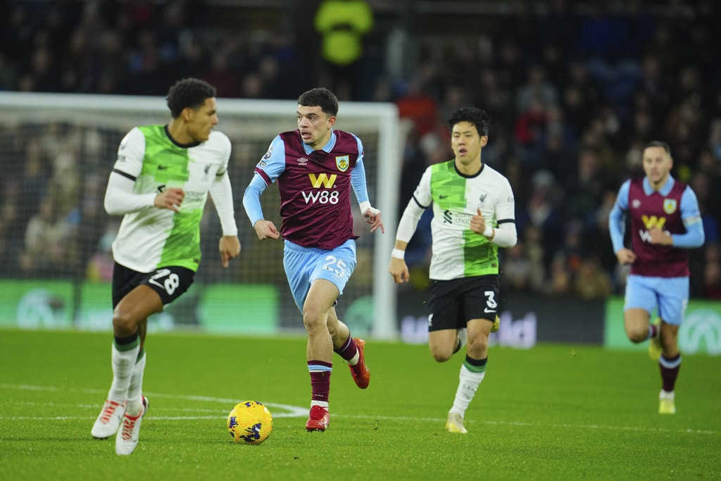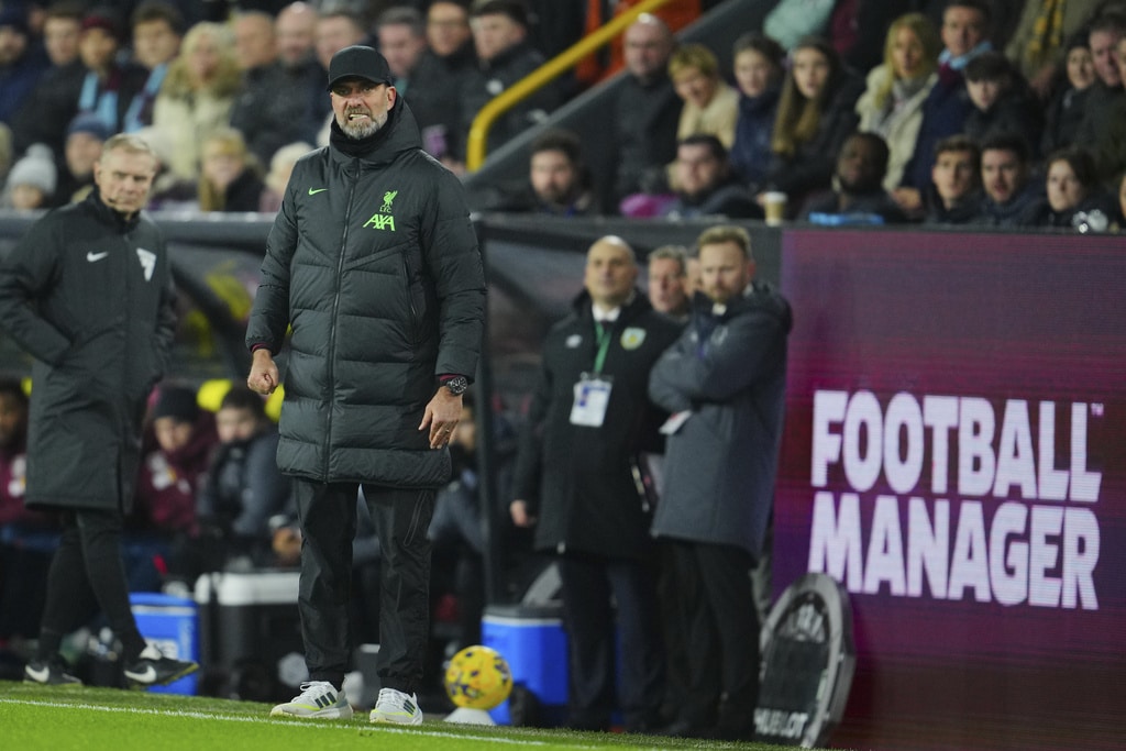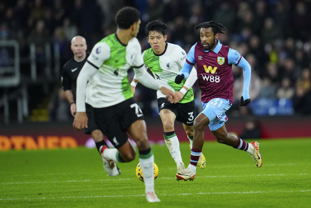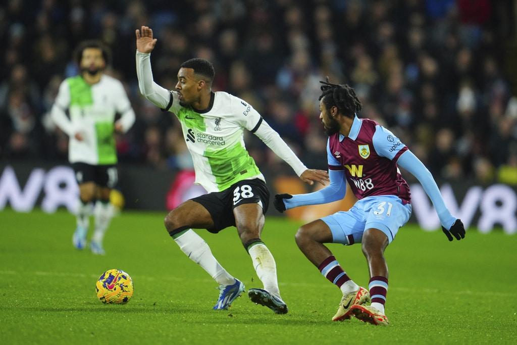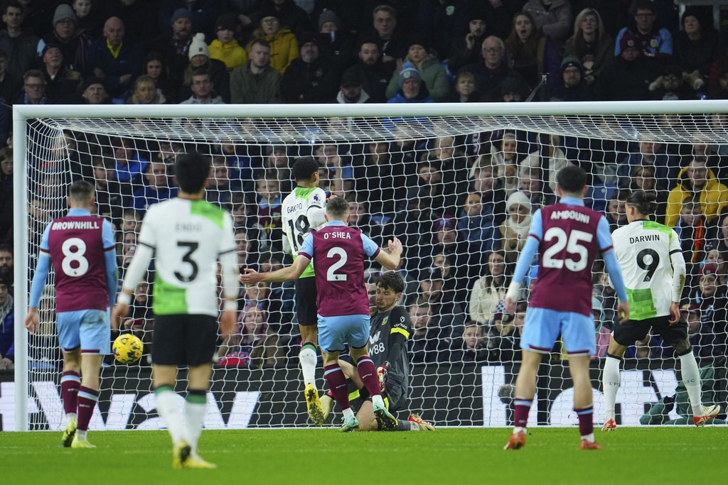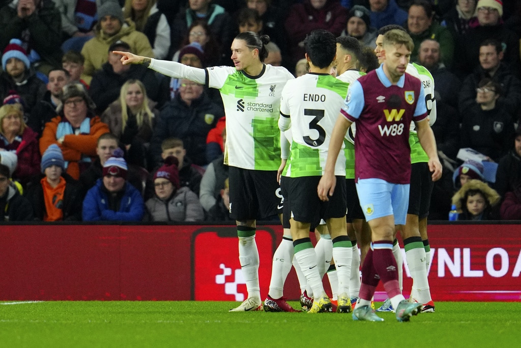 Liverpool’s Darwin Nunez, left, celebrates after scoring the opening goal during the English Premier League soccer match between Burnley and Liverpool at Turf Moor stadium in Burnley, England, Tuesday, Dec. 26, 2023. (AP Photo/Jon Super)Liverpool’s Darwin Nunez claps as he leaves the pitch during the English Premier League soccer match between Burnley and Liverpool at Turf Moor stadium in Burnley, England, Tuesday, Dec. 26, 2023. (AP Photo/Jon Super)Liverpool’s Virgil van Dijk, left, goes after the ball during the English Premier League soccer match between Burnley and Liverpool at Turf Moor stadium in Burnley, England, Tuesday, Dec. 26, 2023. (AP Photo/Jon Super)Liverpool’s Wataru Endo, center, fights for the ball with Burnley’s Mike Tresor, right, during the English Premier League soccer match between Burnley and Liverpool at Turf Moor stadium in Burnley, England, Tuesday, Dec. 26, 2023. (AP Photo/Jon Super)Burnley’s head coach Vincent Kompany, second left, during the English Premier League soccer match between Burnley and Liverpool at Turf Moor stadium in Burnley, England, Tuesday, Dec. 26, 2023. (AP Photo/Jon Super)Liverpool’s Mohamed Salah, left, goes up against Burnley’s Jordan Beyer, center, during the English Premier League soccer match between Burnley and Liverpool at Turf Moor stadium in Burnley, England, Tuesday, Dec. 26, 2023. (AP Photo/Jon Super)Liverpool’s Cody Gakpo, center left, takes a shot on goal during the English Premier League soccer match between Burnley and Liverpool at Turf Moor stadium in Burnley, England, Tuesday, Dec. 26, 2023. (AP Photo/Jon Super)From left, Liverpool’s Cody Gakpo, Burnley’s Zeki Amdouni and Liverpool’s Wataru Endo during the English Premier League soccer match between Burnley and Liverpool at Turf Moor stadium in Burnley, England, Tuesday, Dec. 26, 2023. (AP Photo/Jon Super)Liverpool’s Ryan Gravenberch, center, fights for the ball with Burnley’s Mike Tresor during the English Premier League soccer match between Burnley and Liverpool at Turf Moor stadium in Burnley, England, Tuesday, Dec. 26, 2023. (AP Photo/Jon Super)Burnley’s Charlie Taylor during the English Premier League soccer match between Burnley and Liverpool at Turf Moor stadium in Burnley, England, Tuesday, Dec. 26, 2023. (AP Photo/Jon Super)Liverpool’s manager Jurgen Klopp, center, during the English Premier League soccer match between Burnley and Liverpool at Turf Moor stadium in Burnley, England, Tuesday, Dec. 26, 2023. (AP Photo/Jon Super)