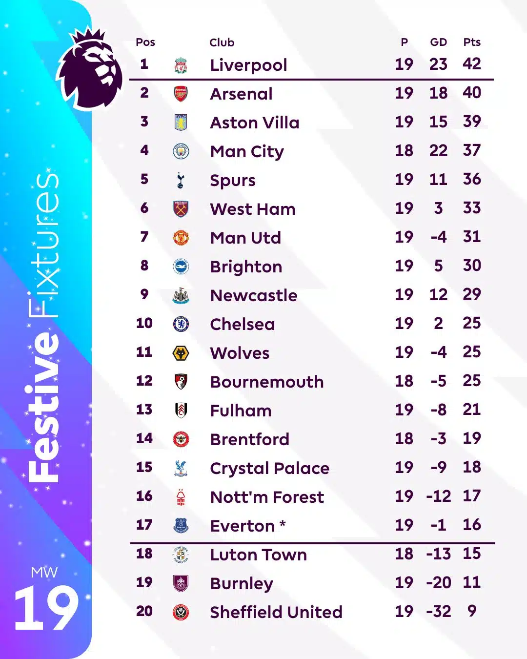 1. ลิเวอร์พูล แข่ง 19 นัด มี 42 แต้ม