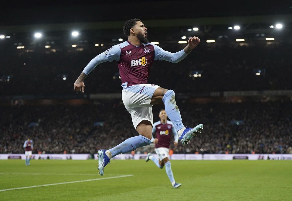 Aston Villa’s Douglas Luiz, center, celebrates after scoring his sides third goal of the game during the English Premier League soccer match between Aston Villa and Burnley at Villa Park, Birmingham, England, Saturday, Dec. 30, 2023. (Jacob King/PA via AP)