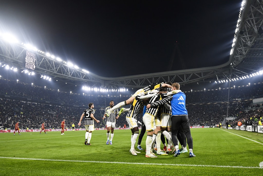 Juventus players celebrate on the field at the end of the Italian Serie A soccer match between Juventus and Roma at the Allianz Stadium in Turin, Italy, Saturday, Dec. 30, 2023. (Marco Alpozzi/LaPresse via AP)