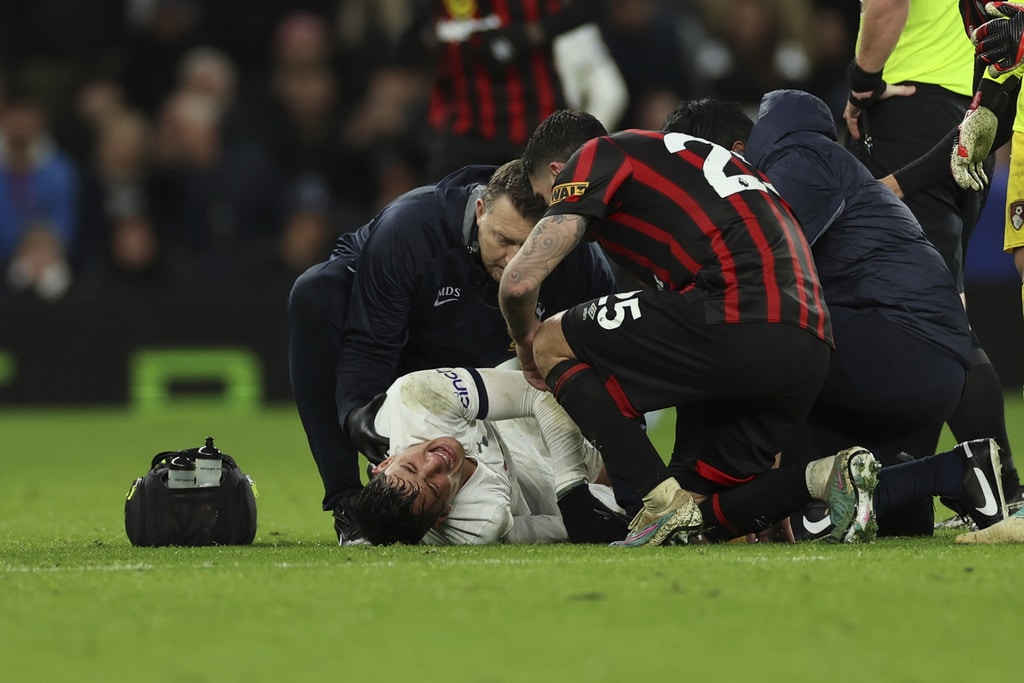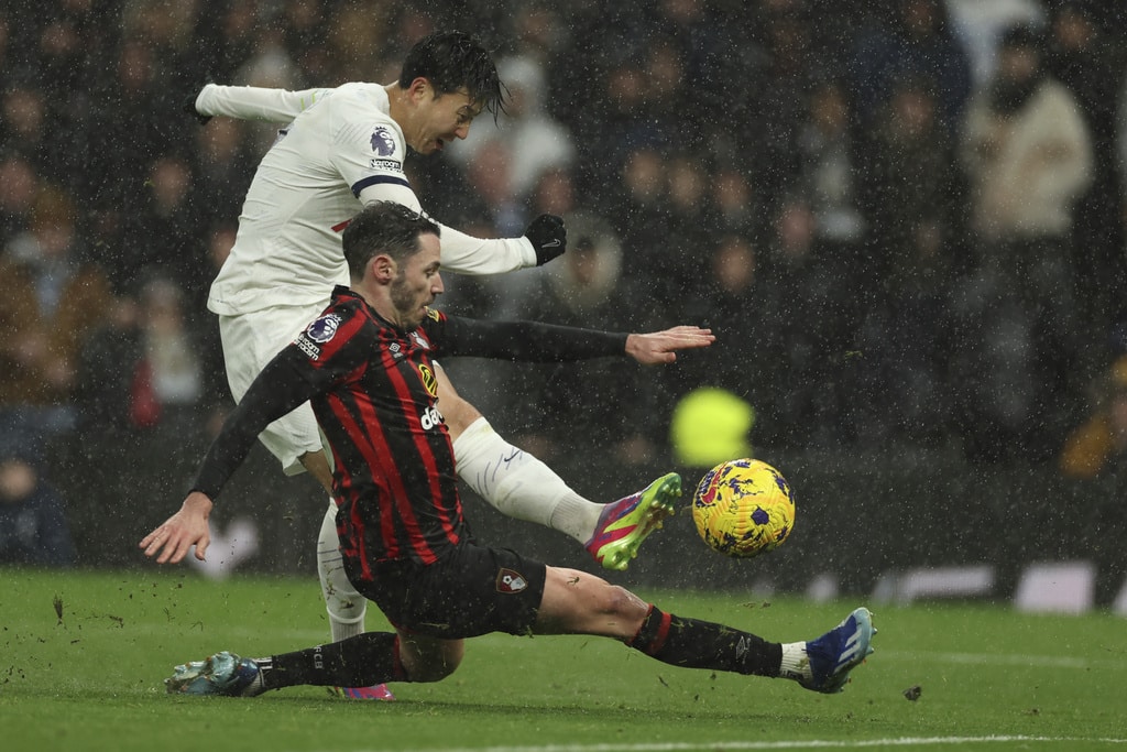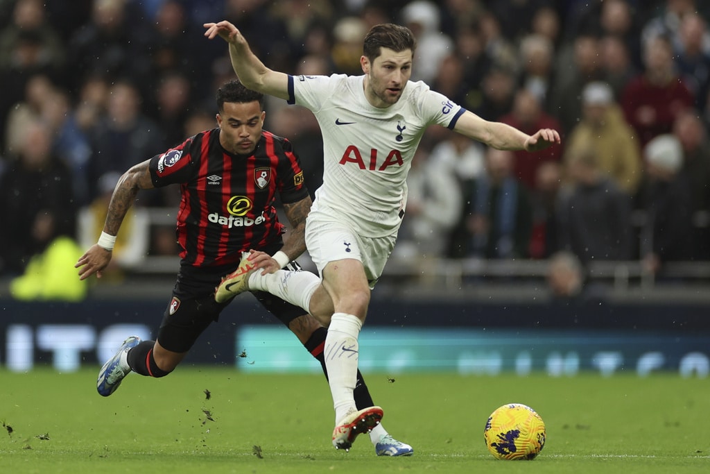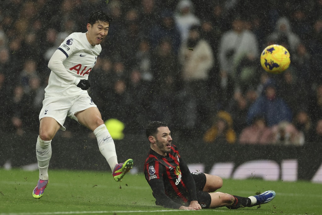 Tottenham’s Pape Matar Sarr celebrates after scoring his side’s opening goal during the English Premier League soccer match between Tottenham Hotspur and AFC Bournemouth at the Tottenham Hotspur Stadium in London, Sunday, Dec. 31, 2023. (AP Photo/Ian Walton)Tottenham’s Son Heung-min celebrates at full time of the English Premier League soccer match between Tottenham Hotspur and AFC Bournemouth at the Tottenham Hotspur Stadium in London, Sunday, Dec. 31, 2023. Tottenham won 3-1. (AP Photo/Ian Walton)Bournemouth’s Antoine Semenyo is tackled by Tottenham’s Pierre-Emile Hojbjerg, right, during the English Premier League soccer match between Tottenham Hotspur and AFC Bournemouth at the Tottenham Hotspur Stadium in London, Sunday, Dec. 31, 2023. (AP Photo/Ian Walton)Tottenham’s Alejo Veliz, centre, is assisted after sustaining an injury during the English Premier League soccer match between Tottenham Hotspur and AFC Bournemouth at the Tottenham Hotspur Stadium in London, Sunday, Dec. 31, 2023. (AP Photo/Ian Walton)Tottenham’s Pedro Porro, left, is challenged by Bournemouth’s Marcos Senesi during the English Premier League soccer match between Tottenham Hotspur and AFC Bournemouth at the Tottenham Hotspur Stadium in London, Sunday, Dec. 31, 2023. (AP Photo/Ian Walton)Tottenham’s Son Heung-min, left, celebrates with Tottenham’s Richarlison after scoring his side’s second goal during the English Premier League soccer match between Tottenham Hotspur and AFC Bournemouth at the Tottenham Hotspur Stadium in London, Sunday, Dec. 31, 2023. (AP Photo/Ian Walton)Tottenham’s Son Heung-min scores his side’s second goal during the English Premier League soccer match between Tottenham Hotspur and AFC Bournemouth at the Tottenham Hotspur Stadium in London, Sunday, Dec. 31, 2023. (AP Photo/Ian Walton)Tottenham’s Son Heung-min, rear, scores his side’s second goal during the English Premier League soccer match between Tottenham Hotspur and AFC Bournemouth at the Tottenham Hotspur Stadium in London, Sunday, Dec. 31, 2023. (AP Photo/Ian Walton)Tottenham’s Ben Davies, right, is challenged by Bournemouth’s Justin Kluivert during the English Premier League soccer match between Tottenham Hotspur and AFC Bournemouth at the Tottenham Hotspur Stadium in London, Sunday, Dec. 31, 2023. (AP Photo/Ian Walton)Tottenham’s Richarlison, right, is challenged by Bournemouth’s Illya Zabarnyi during the English Premier League soccer match between Tottenham Hotspur and AFC Bournemouth at the Tottenham Hotspur Stadium in London, Sunday, Dec. 31, 2023. (AP Photo/Ian Walton)Injured Tottenham’s Pape Matar Sarr, centre, is substituted during the English Premier League soccer match between Tottenham Hotspur and AFC Bournemouth at the Tottenham Hotspur Stadium in London, Sunday, Dec. 31, 2023. (AP Photo/Ian Walton)