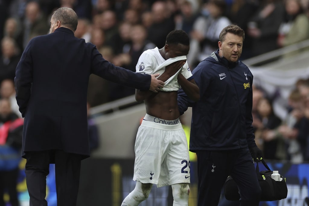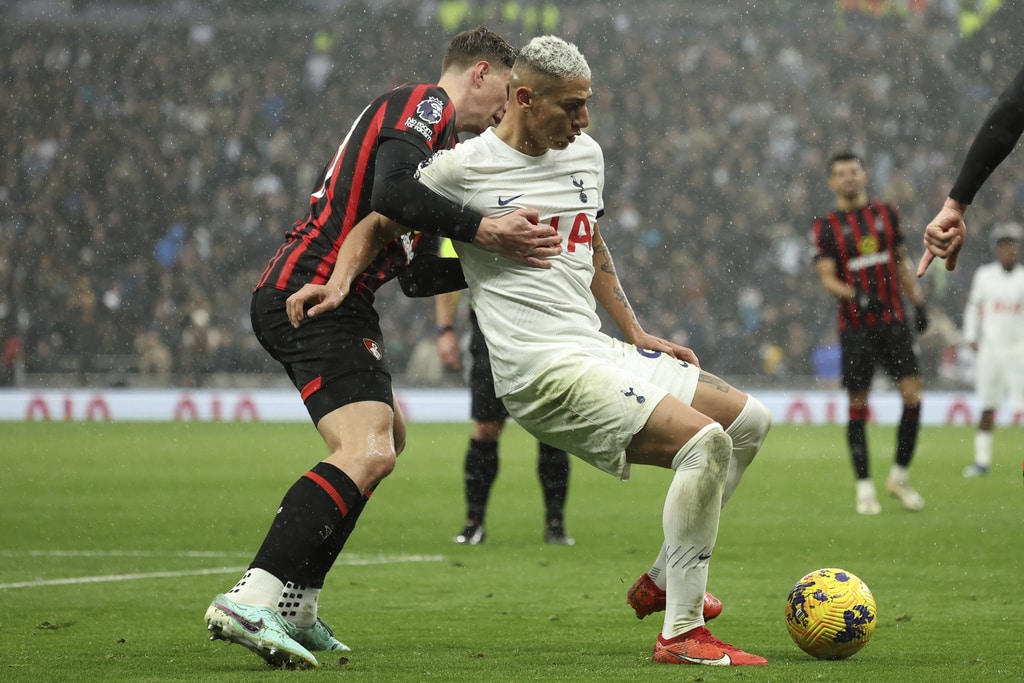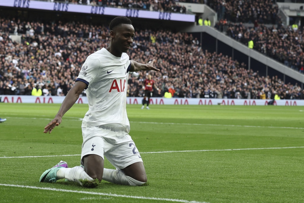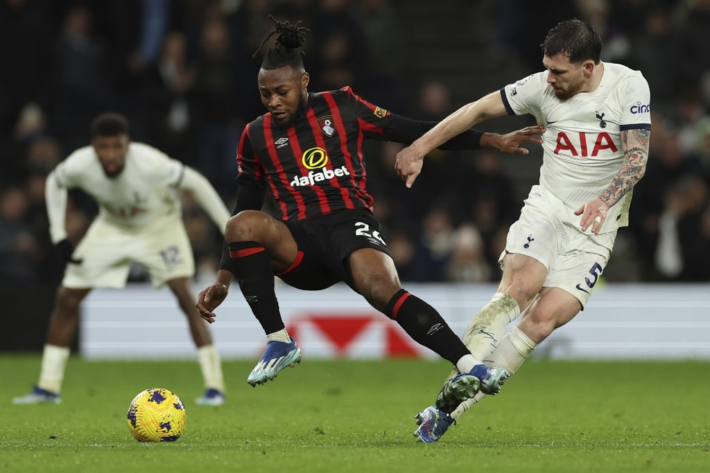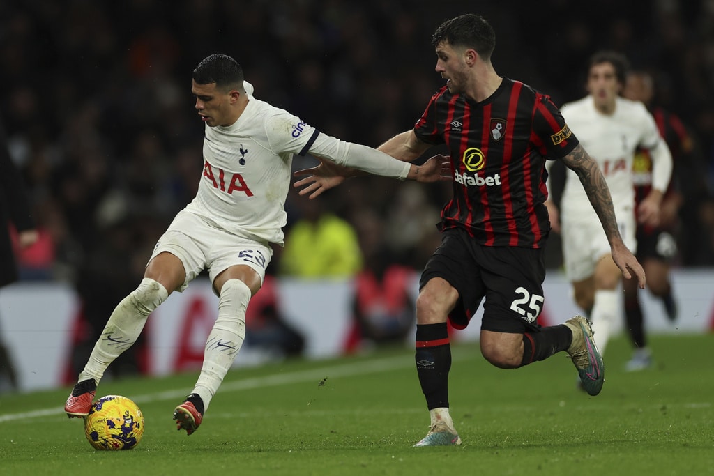 Tottenham’s Pape Matar Sarr celebrates after scoring his side’s opening goal during the English Premier League soccer match between Tottenham Hotspur and AFC Bournemouth at the Tottenham Hotspur Stadium in London, Sunday, Dec. 31, 2023. (AP Photo/Ian Walton)Tottenham’s Son Heung-min celebrates at full time of the English Premier League soccer match between Tottenham Hotspur and AFC Bournemouth at the Tottenham Hotspur Stadium in London, Sunday, Dec. 31, 2023. Tottenham won 3-1. (AP Photo/Ian Walton)Bournemouth’s Antoine Semenyo is tackled by Tottenham’s Pierre-Emile Hojbjerg, right, during the English Premier League soccer match between Tottenham Hotspur and AFC Bournemouth at the Tottenham Hotspur Stadium in London, Sunday, Dec. 31, 2023. (AP Photo/Ian Walton)Tottenham’s Alejo Veliz, centre, is assisted after sustaining an injury during the English Premier League soccer match between Tottenham Hotspur and AFC Bournemouth at the Tottenham Hotspur Stadium in London, Sunday, Dec. 31, 2023. (AP Photo/Ian Walton)Tottenham’s Pedro Porro, left, is challenged by Bournemouth’s Marcos Senesi during the English Premier League soccer match between Tottenham Hotspur and AFC Bournemouth at the Tottenham Hotspur Stadium in London, Sunday, Dec. 31, 2023. (AP Photo/Ian Walton)Tottenham’s Son Heung-min, left, celebrates with Tottenham’s Richarlison after scoring his side’s second goal during the English Premier League soccer match between Tottenham Hotspur and AFC Bournemouth at the Tottenham Hotspur Stadium in London, Sunday, Dec. 31, 2023. (AP Photo/Ian Walton)Tottenham’s Son Heung-min scores his side’s second goal during the English Premier League soccer match between Tottenham Hotspur and AFC Bournemouth at the Tottenham Hotspur Stadium in London, Sunday, Dec. 31, 2023. (AP Photo/Ian Walton)Tottenham’s Son Heung-min, rear, scores his side’s second goal during the English Premier League soccer match between Tottenham Hotspur and AFC Bournemouth at the Tottenham Hotspur Stadium in London, Sunday, Dec. 31, 2023. (AP Photo/Ian Walton)Tottenham’s Ben Davies, right, is challenged by Bournemouth’s Justin Kluivert during the English Premier League soccer match between Tottenham Hotspur and AFC Bournemouth at the Tottenham Hotspur Stadium in London, Sunday, Dec. 31, 2023. (AP Photo/Ian Walton)Tottenham’s Richarlison, right, is challenged by Bournemouth’s Illya Zabarnyi during the English Premier League soccer match between Tottenham Hotspur and AFC Bournemouth at the Tottenham Hotspur Stadium in London, Sunday, Dec. 31, 2023. (AP Photo/Ian Walton)Injured Tottenham’s Pape Matar Sarr, centre, is substituted during the English Premier League soccer match between Tottenham Hotspur and AFC Bournemouth at the Tottenham Hotspur Stadium in London, Sunday, Dec. 31, 2023. (AP Photo/Ian Walton)