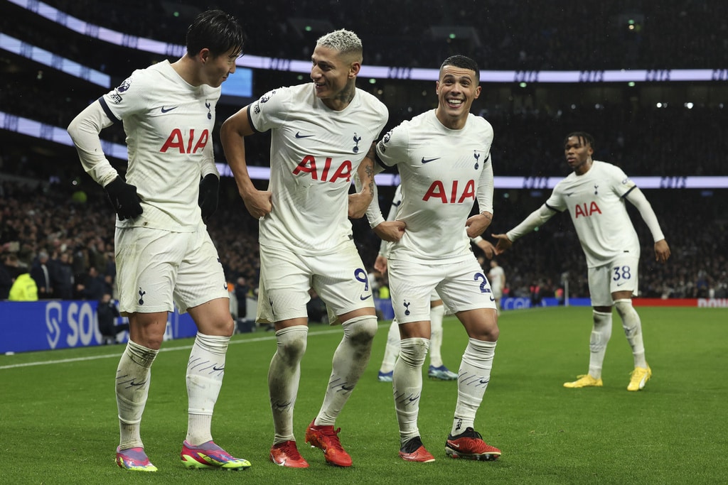 Tottenham’s Richarlison, centre left, celebrates after scoring his side’s third goal during the English Premier League soccer match between Tottenham Hotspur and AFC Bournemouth at the Tottenham Hotspur Stadium in London, Sunday, Dec. 31, 2023. (AP Photo/Ian Walton)