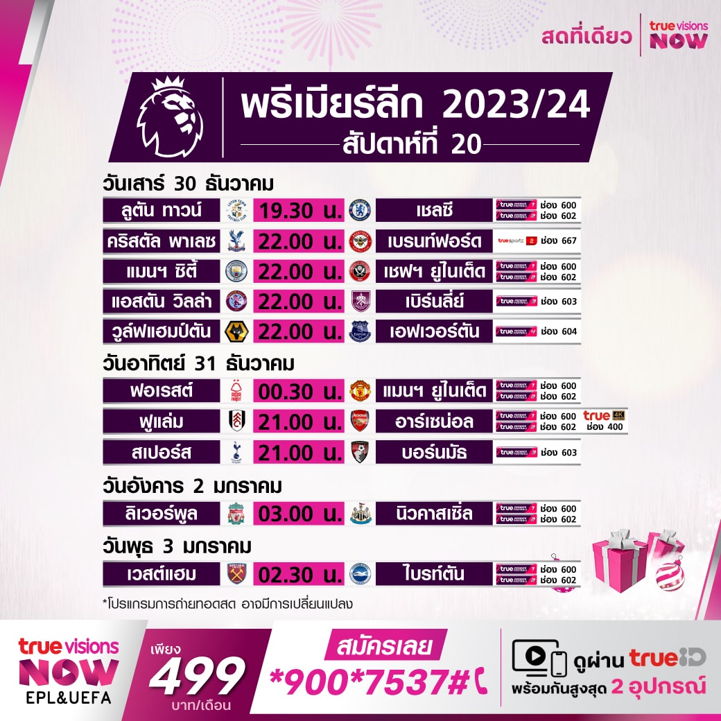 โปรแกรมพรีเมียร์ลีก 2023/24 สัปดาห์ที่ 20 แข่งวันที่ 30 ธ.ค. – 2 ม.ค. นี้ เช็คตารางแข่งพร้อมช่องดูบอลสด