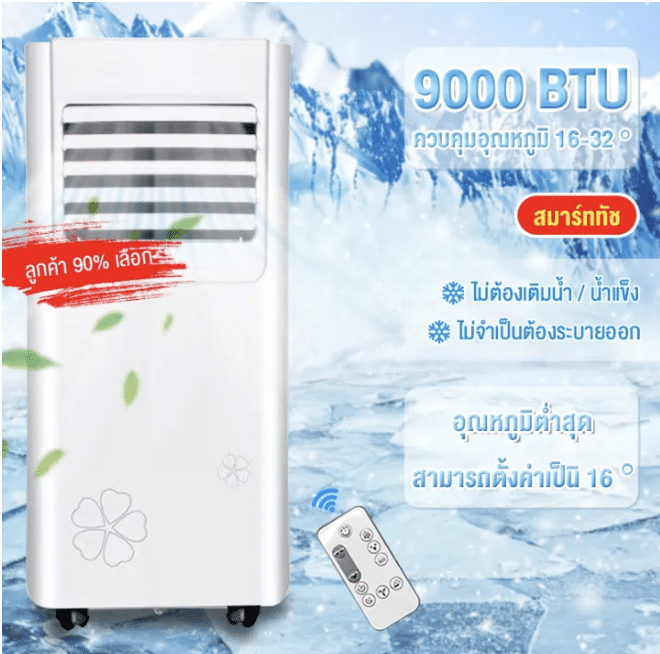 แอร์บ้านเล็ก ขนาด 9000 ยเย็นเร็ว แอร์เคลื่อนที่ เย็นเร็ว เครื่องปรับอากาศเคลื่อนที่ แอร์เคลื่อนที่ แอร์ ไม่ต้องใส่เกล็ดน้ำแข็งหรือน้ำอีกทั้งลมหนาวก็พัดออกมาอย่างรวดเร็ว ปรับความเย็นได้ต่ำสุด 16 องศาเซลเซียส