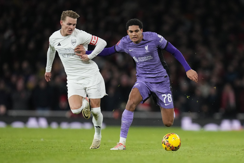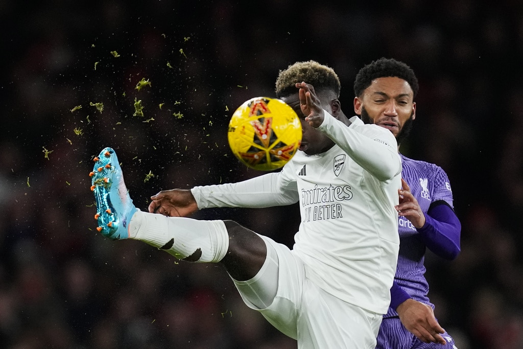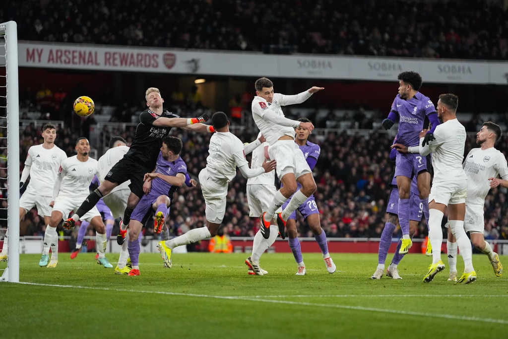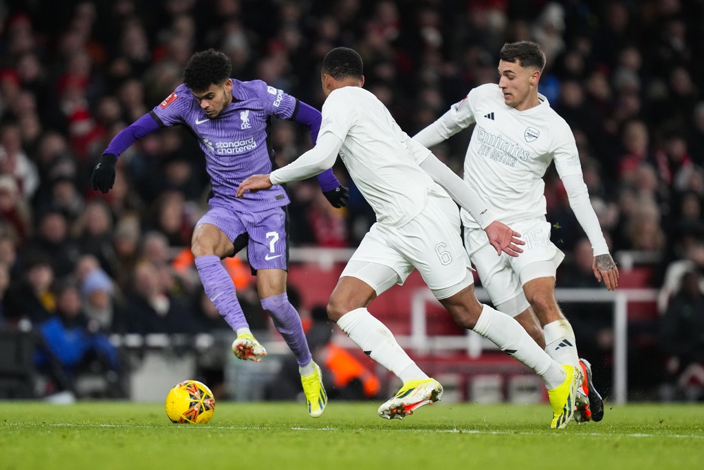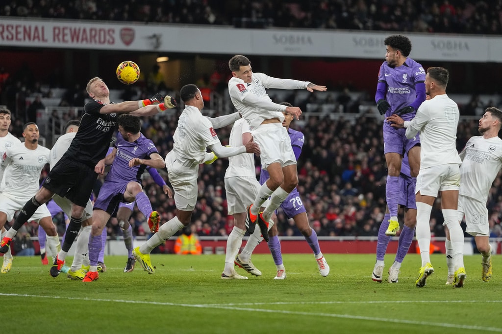 Arsenal’s Martin Odegaard, left, shoots the ball next to Liverpool’s Jarell Quansah during the English FA Cup soccer match between Arsenal and Liverpool at Emirates stadium in London, Sunday, Jan. 7, 2024. (AP Photo/Kirsty Wigglesworth)Arsenal’s Jakub Kiwior, center top, hits the ball to score an own goal during the English FA Cup soccer match between Arsenal and Liverpool at Emirates stadium in London, Sunday, Jan. 7, 2024. Liverpool won 2-0. (AP Photo/Kirsty Wigglesworth)Liverpool’s Luis Diaz, right, and Darwin Nunez celebrate their side’s first goal during the English FA Cup soccer match between Arsenal and Liverpool at Emirates stadium in London, Sunday, Jan. 7, 2024. The opening goal was an own goal by Arsenal’s Jakub Kiwior. (AP Photo/Kirsty Wigglesworth)Liverpool’s Ibrahima Konate, right, and Thiago celebrate their side’s first goal during the English FA Cup soccer match between Arsenal and Liverpool at Emirates stadium in London, Sunday, Jan. 7, 2024. The opening goal was an own goal by Arsenal’s Jakub Kiwior. (AP Photo/Kirsty Wigglesworth)Liverpool’s Luis Diaz celebrates his side’s first goal during the English FA Cup soccer match between Arsenal and Liverpool at Emirates stadium in London, Sunday, Jan. 7, 2024. The opening goal was an own goal by Arsenal’s Jakub Kiwior. (AP Photo/Kirsty Wigglesworth)Liverpool’s Luis Diaz celebrates his side’s first goal during the English FA Cup soccer match between Arsenal and Liverpool at Emirates stadium in London, Sunday, Jan. 7, 2024. The opening goal was an own goal by Arsenal’s Jakub Kiwior. (AP Photo/Kirsty Wigglesworth)Liverpool’s Luis Diaz celebrates his side’s first goal during the English FA Cup soccer match between Arsenal and Liverpool at Emirates stadium in London, Sunday, Jan. 7, 2024. The opening goal was an own goal by Arsenal’s Jakub Kiwior. (AP Photo/Kirsty Wigglesworth)Arsenal’s Jakub Kiwior, center top, hits the ball to score an own goal during the English FA Cup soccer match between Arsenal and Liverpool at Emirates stadium in London, Sunday, Jan. 7, 2024. (AP Photo/Kirsty Wigglesworth)Liverpool’s Jarell Quansah, right, battles for the ball with Arsenal’s Martin Odegaard during the English FA Cup soccer match between Arsenal and Liverpool at Emirates stadium in London, Sunday, Jan. 7, 2024. (AP Photo/Kirsty Wigglesworth)Liverpool’s Darwin Nunez, right, battles for the ball with Arsenal’s William Saliba during the English FA Cup soccer match between Arsenal and Liverpool at Emirates stadium in London, Sunday, Jan. 7, 2024. (AP Photo/Kirsty Wigglesworth)Liverpool’s Luis Diaz, left, fights for the ball with Arsenal’s Gabriel Magalhaes, center, and Jakub Kiwior during the English FA Cup soccer match between Arsenal and Liverpool at Emirates stadium in London, Sunday, Jan. 7, 2024. (AP Photo/Kirsty Wigglesworth)Arsenal’s Bukayo Saka, left, fights for the ball with Liverpool’s Joe Gomez during the English FA Cup soccer match between Arsenal and Liverpool at Emirates stadium in London, Sunday, Jan. 7, 2024. (AP Photo/Kirsty Wigglesworth)Liverpool’s Trent Alexander-Arnold, right, vies for the ball with Arsenal’s Kai Havertz during the English FA Cup soccer match between Arsenal and Liverpool at Emirates stadium in London, Sunday, Jan. 7, 2024. (AP Photo/Kirsty Wigglesworth)