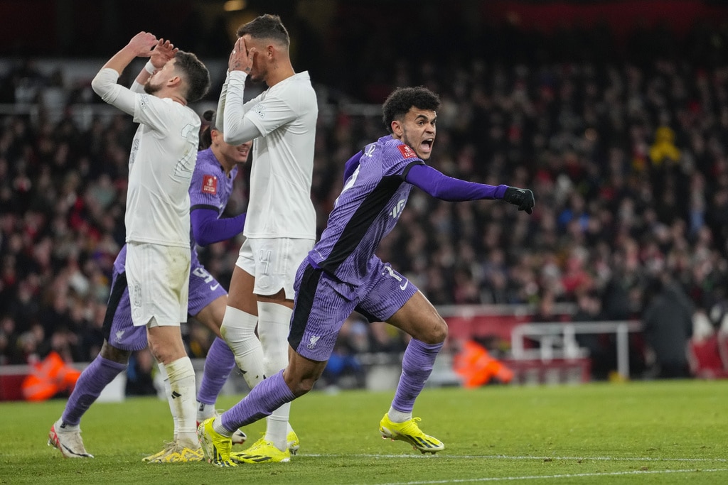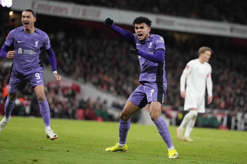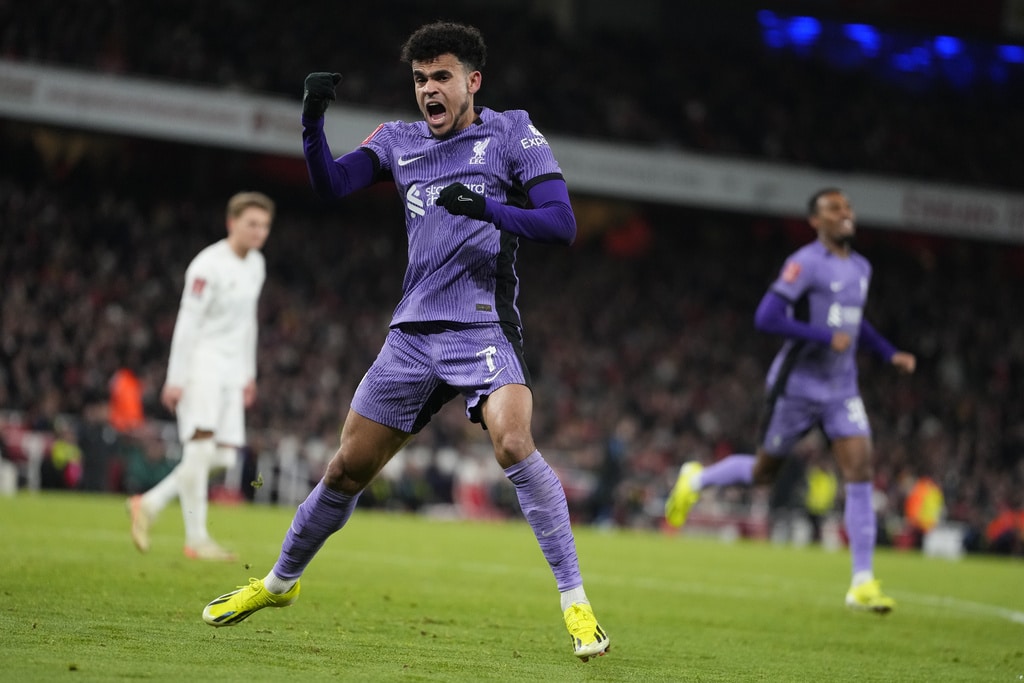 Liverpool’s Luis Diaz celebrates his side’s first goal during the English FA Cup soccer match between Arsenal and Liverpool at Emirates stadium in London, Sunday, Jan. 7, 2024. The opening goal was an own goal by Arsenal’s Jakub Kiwior. (AP Photo/Kirsty Wigglesworth)