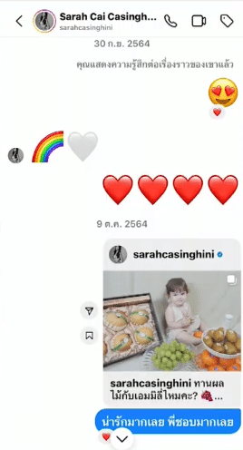ตัวอย่างบทสนทนาของคนในวงการที่หนุ่มทักไปหา เช่น ซาร่า คาซิงกินี ก็มีการส่งรูปอิโมจิหัวใจให้กัน อีกทั้งยังมีบทสนทนาที่หนุ่มชมลูกของซาร่าว่าน่ารักอีกด้วย หรือแม้นางเอกตัวท็อป นุ่น วรนุช ก็ยังมีการส่งอิโมจิหัวใจ และอวยพรวันเกิดให้ด้วย รวมไปถึงดาราสาว แอฟ ทักษอร ที่หนุ่มทักไปชมว่า “สวยจังค่ะ” ซึ่งสาวแอฟก็ส่องข้อความกลับมาว่า “พ่อชม ขอบคุณค่า” พร้อมด้วยอิโมจิรูปหัวใจ