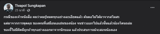 ล่าสุด “ทิซัง” หรือ ทิวาพล สังขพันธ์ ล่ามคนดังของ สุภโชค สารชาติ ได้ออกมาโพสต์ข้อความผ่านทางเฟซบุ๊กส่วนตัวถึงกรณีของเจ้าบุ๊คเอาไว้ว่า “กรณีของเจ้าหนังสือ ผมว่าผมรู้หมดทุกอย่างละเอียดแล้ว ต้นตอไม่ได้มาจากสโมสร”