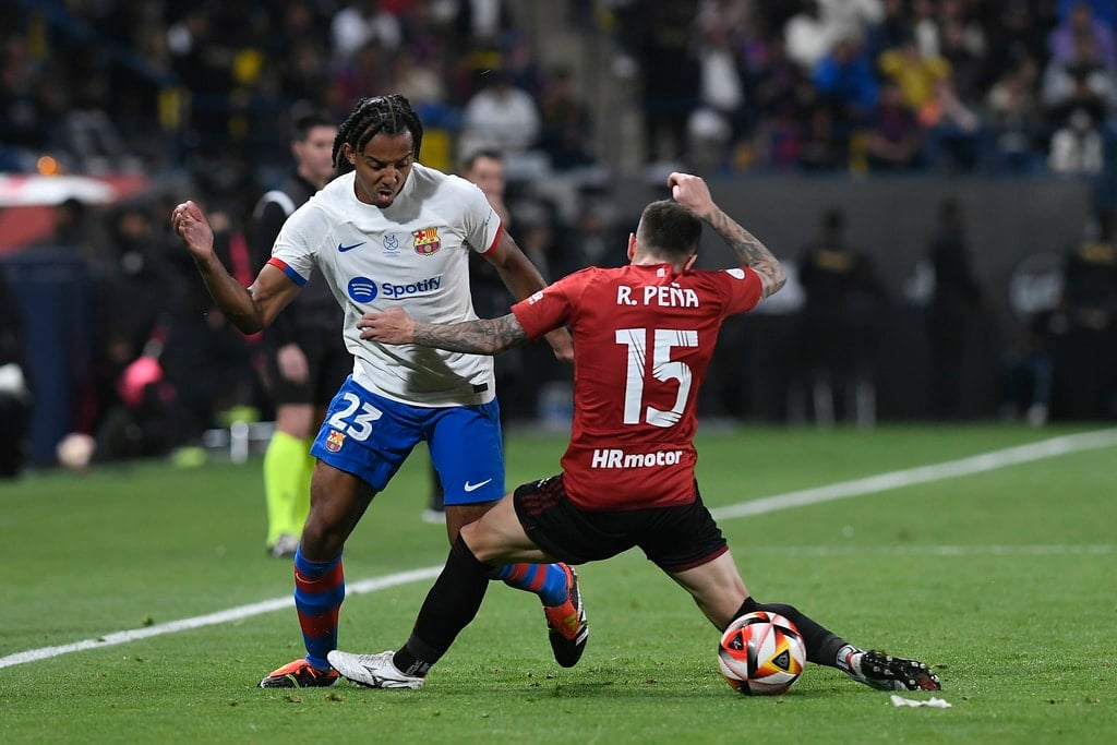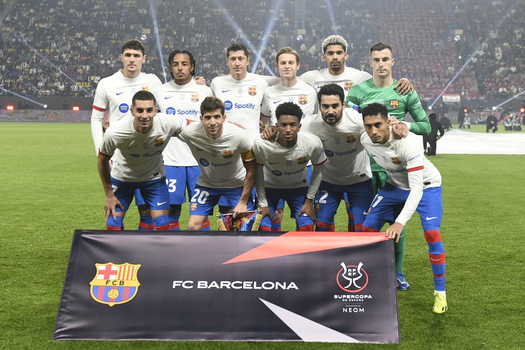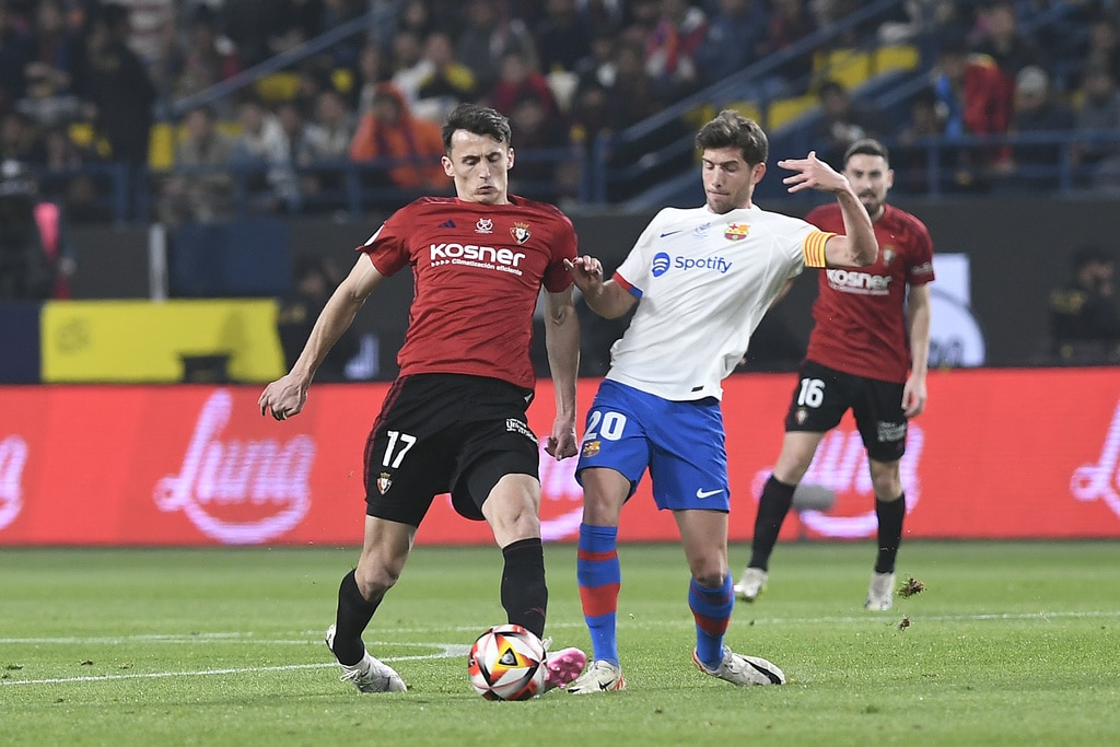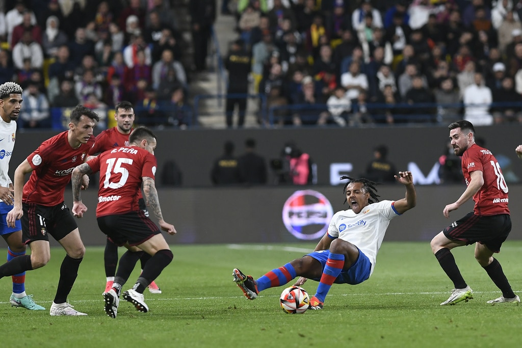 Barcelona’s Raphinha fights for the ball with Osasuna player during the Spanish Super Cup semi final soccer match between Osasuna and Barcelona at Al Awal Park Stadium in Riyadh, Saudi Arabia, Thursday, Jan. 11, 2024. (AP Photo)Barcelona players pose for a team group photo before the Spanish Super Cup semi final soccer match between Osasuna and Barcelona at Al Awal Park Stadium in Riyadh, Saudi Arabia, Thursday, Jan. 11, 2024. (AP Photo)Barcelona’s Alejandro Balde, left, fights for the ball with Osasuna’s Ante Budimir, center, during the Spanish Super Cup semi final soccer match between Osasuna and Barcelona at Al Awal Park Stadium in Riyadh, Saudi Arabia, Thursday, Jan. 11, 2024. (AP Photo)Osasuna’s David Garcia jumps for the ball during the Spanish Super Cup semi final soccer match between Osasuna and Barcelona at Al Awal Park Stadium in Riyadh, Saudi Arabia, Thursday, Jan. 11, 2024. (AP Photo)Barcelona’s Jules Kounde, left, fights for the ball with Osasuna’s Ruben Pena during the Spanish Super Cup semi final soccer match between Osasuna and Barcelona at Al Awal Park Stadium in Riyadh, Saudi Arabia, Thursday, Jan. 11, 2024. (AP Photo)Barcelona’s Jules Kounde falls on the ground during the Spanish Super Cup semi final soccer match between Osasuna and Barcelona at Al Awal Park Stadium in Riyadh, Saudi Arabia, Thursday, Jan. 11, 2024. (AP Photo)Barcelona’s Ferran Torres reacts during the Spanish Super Cup semi final soccer match between Osasuna and Barcelona at Al Awal Park Stadium in Riyadh, Saudi Arabia, Thursday, Jan. 11, 2024. (AP Photo)Barcelona’s head coach Xavi Hernandez greets fans before the Spanish Super Cup semi final soccer match between Osasuna and Barcelona at Al Awal Park Stadium in Riyadh, Saudi Arabia, Thursday, Jan. 11, 2024. (AP Photo)Osasuna’s Ante Budimir, left, fights for the ball with Barcelona’s Sergi Roberto during the Spanish Super Cup semi final soccer match between Osasuna and Barcelona at Al Awal Park Stadium in Riyadh, Saudi Arabia, Thursday, Jan. 11, 2024. (AP Photo)
