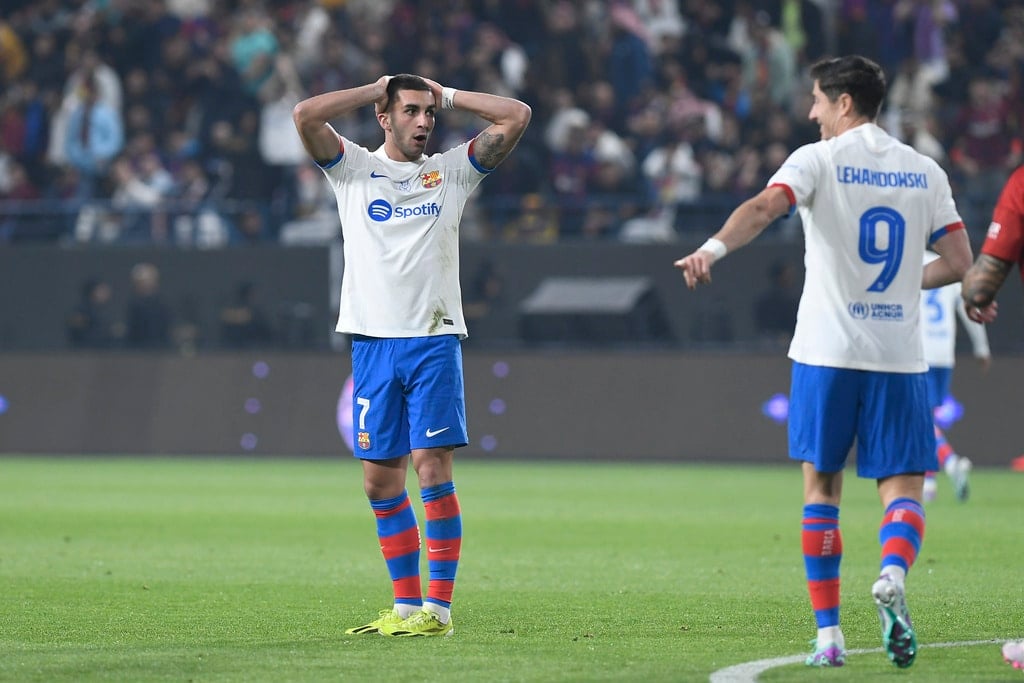 Barcelona look on after the Spanish Super Cup semi final soccer match between Osasuna and Barcelona at Al Awal Park Stadium in Riyadh, Saudi Arabia, Thursday, Jan. 11, 2024. (AP Photo)