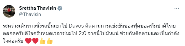 นายกรัฐมนตรี เศรษฐา ซึ่งอยู่ระหว่างปฏิบัติภารกิจที่ประเทศสวิสเซอร์แลนด์ ได้ติดตามให้กำลังใจทัพช้างศึกมาโดยตลอด และหลังจบเกมเมื่อคืนที่ผ่านมาก็ได้โพสต์ข้อความผ่านโซเชี่ยลมีเดีย X ระบุว่า “ระหว่างเดินทางนั่งรถขึ้นเขาไป Davos ติดตามการแข่งขันของฟุตบอลทีมชาติไทยตลอดครับดีใจครับหมดเวลาชนะไป 2:0 จากนี้ไปมันแน่ ช่วยกันติดตามและเป็นกำลังใจต่อครับ ”