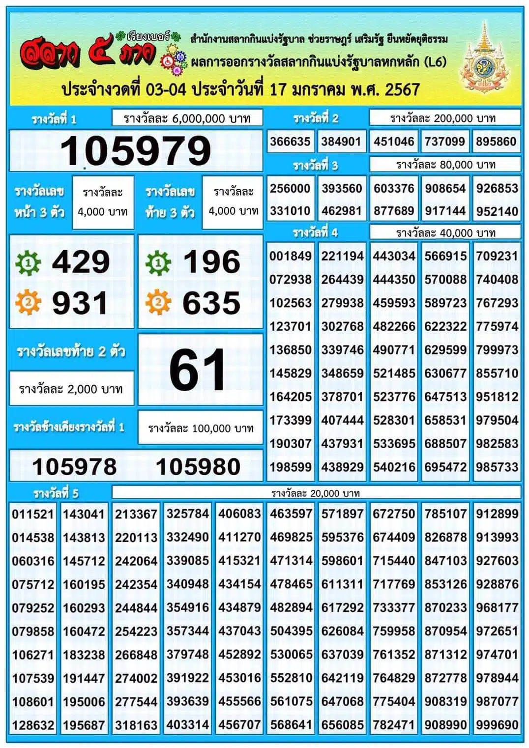 ทั้งนี้ บรรดานักแสวงโชคและเซียนหวยทั่วสารทิศทุกท่าน สามารถตรวจสอบผลสลากกินแบ่งรัฐบาล ประจำงวดวันเสาร์ที่ 17 ม.ค. 67 ได้ตามตารางด้านล่างนี้