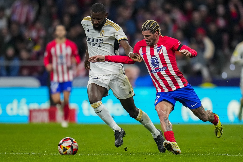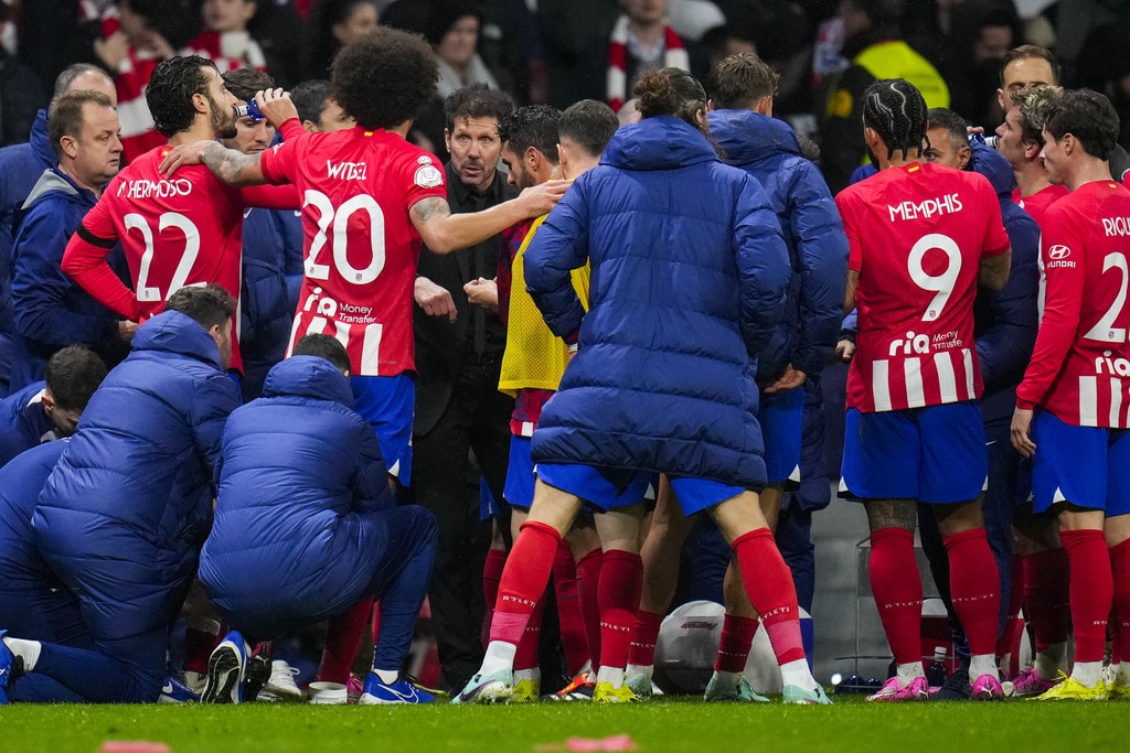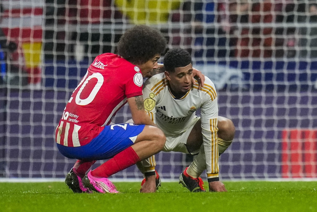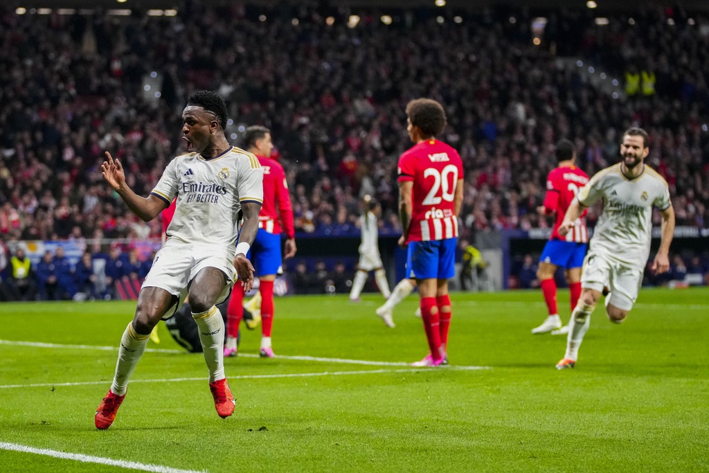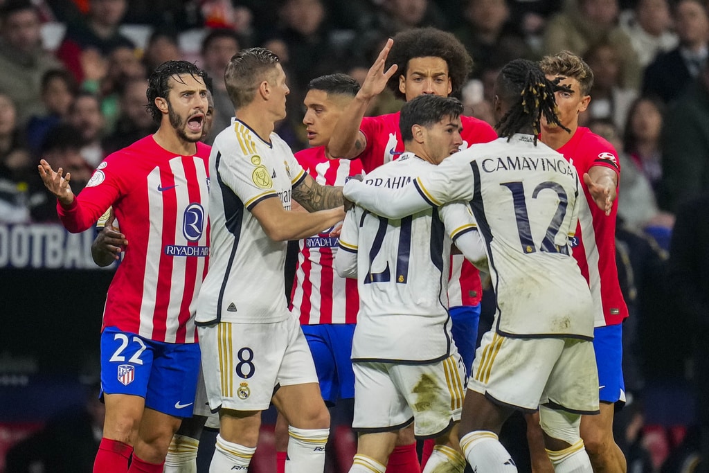 Atletico Madrid’s Axel Witsel, left, and Real Madrid’s Vinicius Junior duel for the ball during the Copa del Rey round of 16 soccer match in Madrid, Spain, Thursday, Jan. 18, 2024. (AP Photo/Manu Fernandez)Real Madrid’s Vinicius Junior, left, celebrates his team’s goal during the Copa del Rey round of 16 soccer match against Atletico Madrid in Madrid, Spain, Thursday, Jan. 18, 2024. (AP Photo/Manu Fernandez)Real Madrid players, foreground, and Atletico Madrid players argue during their Copa del Rey round of 16 soccer match in Madrid, Spain, Thursday, Jan. 18, 2024. (AP Photo/Manu Fernandez)Real Madrid’s Antonio Rudiger, left, duels for the ball with Atletico Madrid’s Rodrigo De Paul during their Copa del Rey round of 16 soccer match in Madrid, Spain, Thursday, Jan. 18, 2024. (AP Photo/Manu Fernandez)Atletico Madrid’s Marcos Llorente duels for the ball with Real Madrid’s Nacho, foreground, during their Copa del Rey round of 16 soccer match in Madrid, Spain, Thursday, Jan. 18, 2024. (AP Photo/Manu Fernandez)Real Madrid’s Brahim Diaz, foreground, duels for the ball with Atletico Madrid’s Samuel Lino during their Copa del Rey round of 16 soccer match in Madrid, Spain, Thursday, Jan. 18, 2024. (AP Photo/Manu Fernandez)Atletico Madrid’s Antoine Griezmann, left, celebrates after scoring his team’s third goal against Real Madrid during their Copa del Rey round of 16 soccer match in Madrid, Spain, Thursday, Jan. 18, 2024. (AP Photo/Manu Fernandez)Atletico Madrid’s head coach Diego Simeone, background, talks to players during the Copa del Rey round of 16 soccer match between Real Madrid and Atletico Madrid in Madrid, Spain, Thursday, Jan. 18, 2024. (AP Photo/Manu Fernandez)Real Madrid’s head coach Carlo Ancelotti talks to players during the Copa del Rey round of 16 soccer match between Real Madrid and Atletico Madrid in Madrid, Spain, Thursday, Jan. 18, 2024. (AP Photo/Manu Fernandez)Real Madrid’s Dani Carvajal, foreground, controls the ball next to Atletico Madrid’s Riquelme during the Copa del Rey round of 16 soccer match between Real Madrid and Atletico Madrid in Madrid, Spain, Thursday, Jan. 18, 2024. (AP Photo/Manu Fernandez)Atletico Madrid’s head coach Diego Simeone receives a yellow card during the Copa del Rey round of 16 soccer match against Real Madrid in Madrid, Spain, Thursday, Jan. 18, 2024. (AP Photo/Manu Fernandez)Atletico Madrid’s Riquelme scores during the Copa del Rey round of 16 soccer match between Real Madrid and Atletico Madrid in Madrid, Spain, Thursday, Jan. 18, 2024. (AP Photo/Manu Fernandez)Atletico Madrid’s Riquelme is congratulated after scoring during the Copa del Rey round of 16 soccer match between Real Madrid and Atletico Madrid in Madrid, Spain, Thursday, Jan. 18, 2024. (AP Photo/Manu Fernandez)Atletico Madrid’s Axel Witsel, left, talks to Real Madrid’s Jude Bellingham after their Copa del Rey round of 16 soccer match in Madrid, Spain, Thursday, Jan. 18, 2024. (AP Photo/Manu Fernandez)