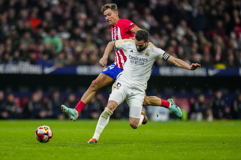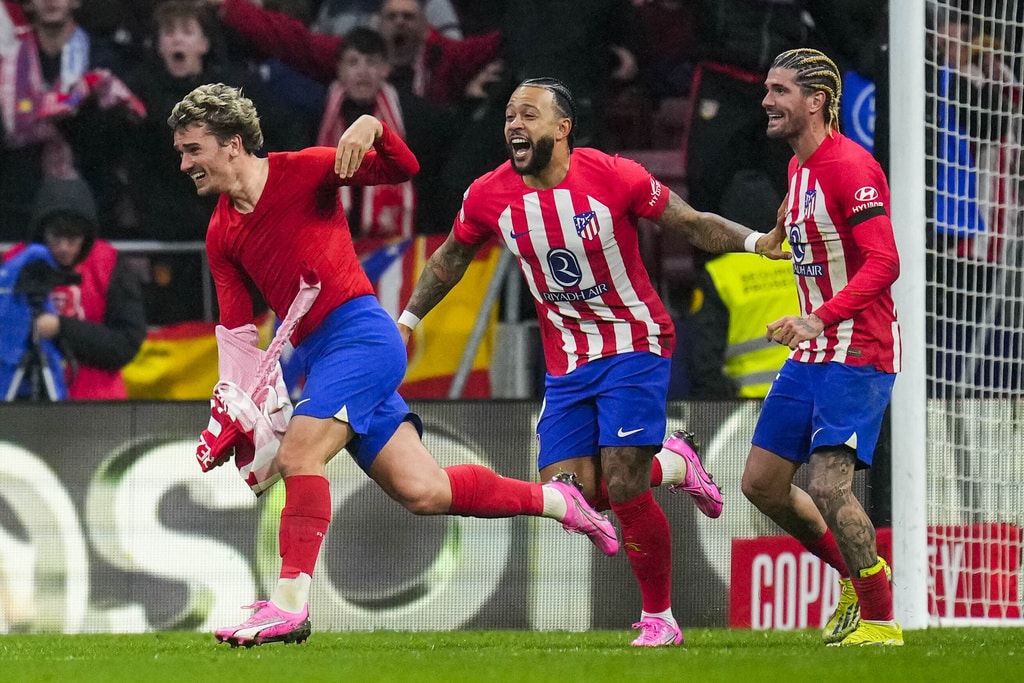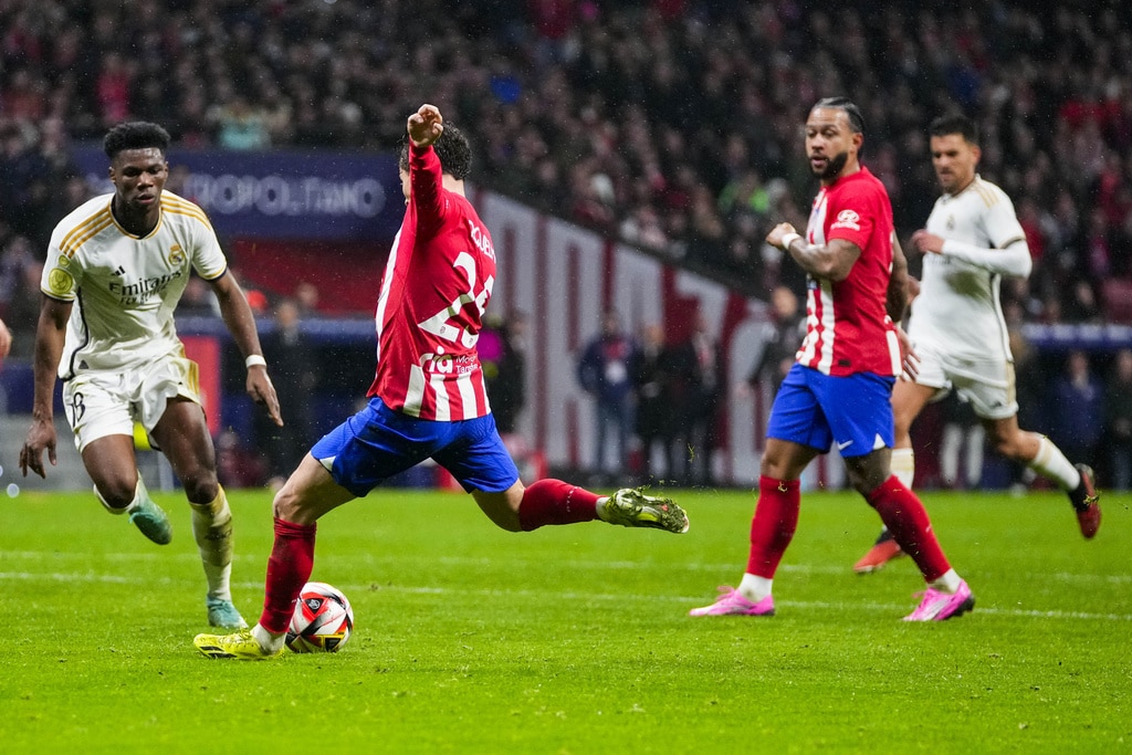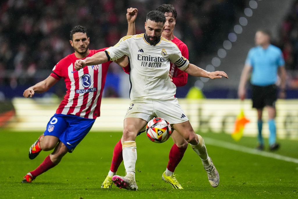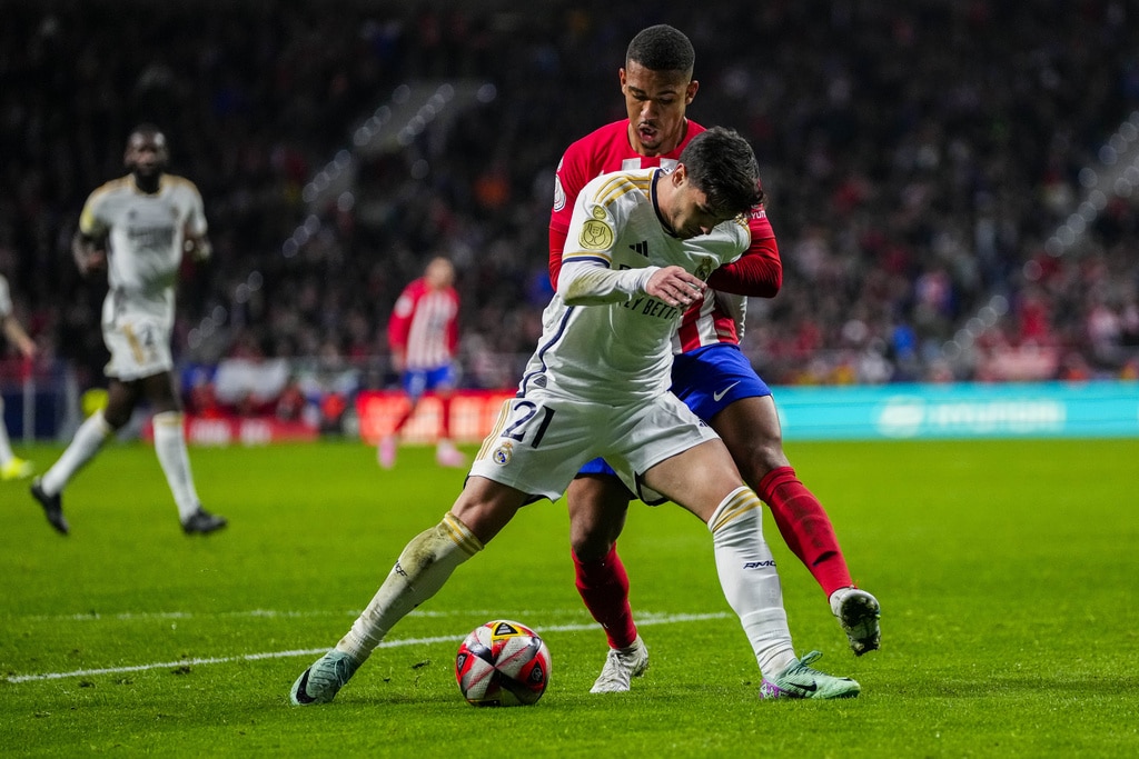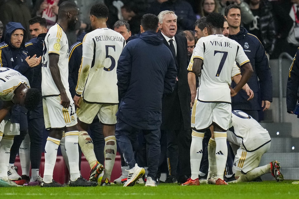 Atletico Madrid’s Axel Witsel, left, and Real Madrid’s Vinicius Junior duel for the ball during the Copa del Rey round of 16 soccer match in Madrid, Spain, Thursday, Jan. 18, 2024. (AP Photo/Manu Fernandez)Real Madrid’s Vinicius Junior, left, celebrates his team’s goal during the Copa del Rey round of 16 soccer match against Atletico Madrid in Madrid, Spain, Thursday, Jan. 18, 2024. (AP Photo/Manu Fernandez)Real Madrid players, foreground, and Atletico Madrid players argue during their Copa del Rey round of 16 soccer match in Madrid, Spain, Thursday, Jan. 18, 2024. (AP Photo/Manu Fernandez)Real Madrid’s Antonio Rudiger, left, duels for the ball with Atletico Madrid’s Rodrigo De Paul during their Copa del Rey round of 16 soccer match in Madrid, Spain, Thursday, Jan. 18, 2024. (AP Photo/Manu Fernandez)Atletico Madrid’s Marcos Llorente duels for the ball with Real Madrid’s Nacho, foreground, during their Copa del Rey round of 16 soccer match in Madrid, Spain, Thursday, Jan. 18, 2024. (AP Photo/Manu Fernandez)Real Madrid’s Brahim Diaz, foreground, duels for the ball with Atletico Madrid’s Samuel Lino during their Copa del Rey round of 16 soccer match in Madrid, Spain, Thursday, Jan. 18, 2024. (AP Photo/Manu Fernandez)Atletico Madrid’s Antoine Griezmann, left, celebrates after scoring his team’s third goal against Real Madrid during their Copa del Rey round of 16 soccer match in Madrid, Spain, Thursday, Jan. 18, 2024. (AP Photo/Manu Fernandez)Atletico Madrid’s head coach Diego Simeone, background, talks to players during the Copa del Rey round of 16 soccer match between Real Madrid and Atletico Madrid in Madrid, Spain, Thursday, Jan. 18, 2024. (AP Photo/Manu Fernandez)Real Madrid’s head coach Carlo Ancelotti talks to players during the Copa del Rey round of 16 soccer match between Real Madrid and Atletico Madrid in Madrid, Spain, Thursday, Jan. 18, 2024. (AP Photo/Manu Fernandez)Real Madrid’s Dani Carvajal, foreground, controls the ball next to Atletico Madrid’s Riquelme during the Copa del Rey round of 16 soccer match between Real Madrid and Atletico Madrid in Madrid, Spain, Thursday, Jan. 18, 2024. (AP Photo/Manu Fernandez)Atletico Madrid’s head coach Diego Simeone receives a yellow card during the Copa del Rey round of 16 soccer match against Real Madrid in Madrid, Spain, Thursday, Jan. 18, 2024. (AP Photo/Manu Fernandez)Atletico Madrid’s Riquelme scores during the Copa del Rey round of 16 soccer match between Real Madrid and Atletico Madrid in Madrid, Spain, Thursday, Jan. 18, 2024. (AP Photo/Manu Fernandez)Atletico Madrid’s Riquelme is congratulated after scoring during the Copa del Rey round of 16 soccer match between Real Madrid and Atletico Madrid in Madrid, Spain, Thursday, Jan. 18, 2024. (AP Photo/Manu Fernandez)Atletico Madrid’s Axel Witsel, left, talks to Real Madrid’s Jude Bellingham after their Copa del Rey round of 16 soccer match in Madrid, Spain, Thursday, Jan. 18, 2024. (AP Photo/Manu Fernandez)