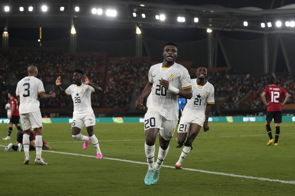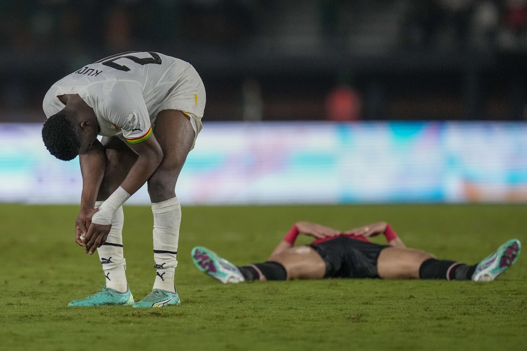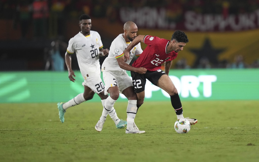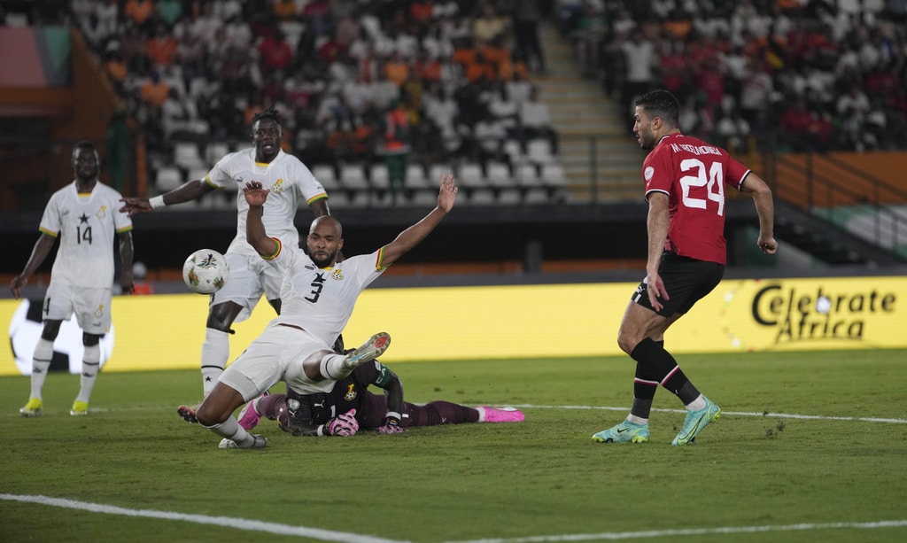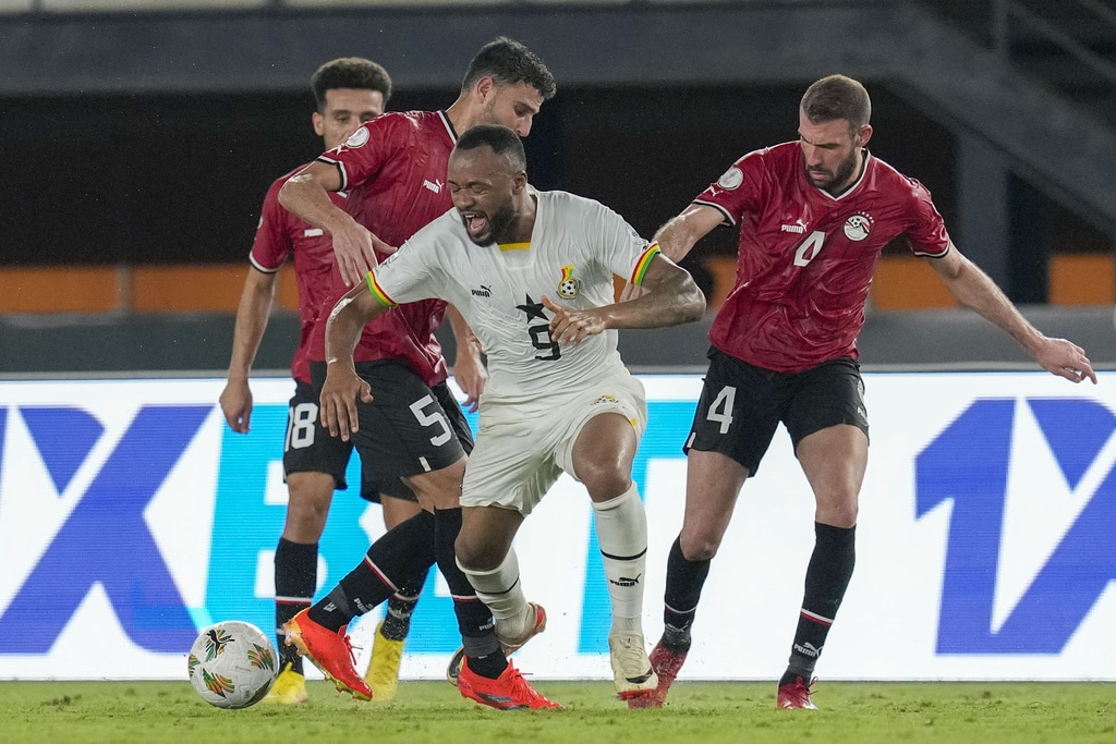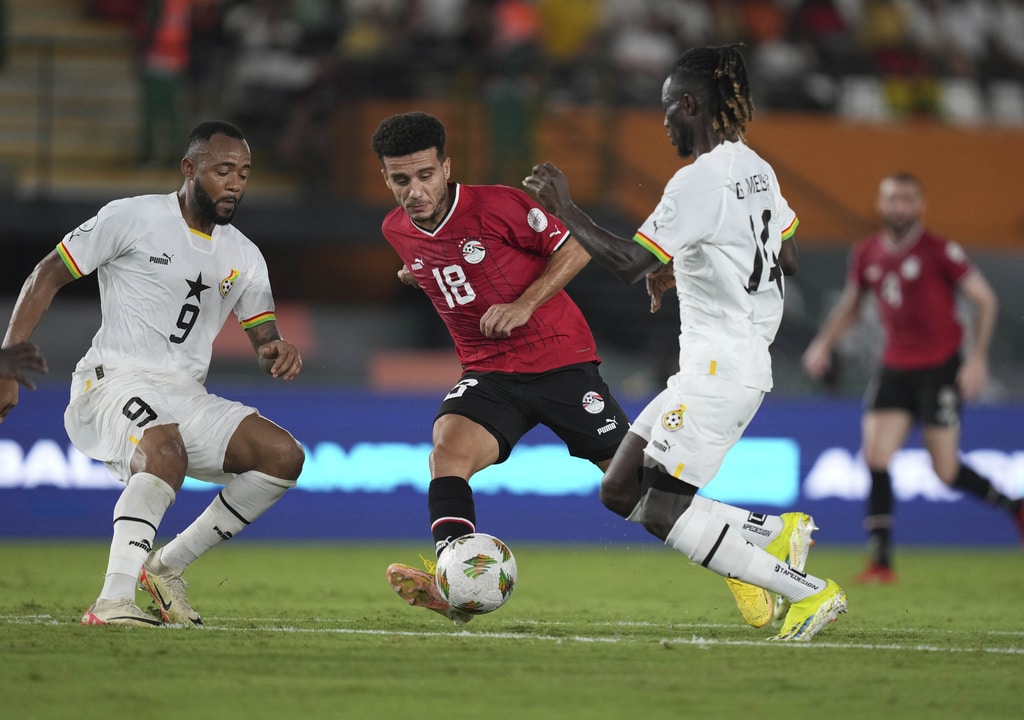 Ghana’s Mohammed Kudus, left, duels for the ball with Egypt’s Mohamed Elneny during the African Cup of Nations Group B soccer match between Egypt and Ghana in Abidjan, Ivory Coast, Thursday, Jan.18, 2024. (AP Photo/Themba Hadebe)Ghana’s Mohammed Kudus celebrates after scoring his side’s second goal during the African Cup of Nations Group B soccer match between Egypt and Ghana in Abidjan, Ivory Coast, Thursday, Jan.18, 2024. (AP Photo/Themba Hadebe)Egypt’s Omar Marmoush, rights, duels for the ball with Ghana’s Denis Frimpong, centre, during the African Cup of Nations Group B soccer match between Egypt and Ghana in Abidjan, Ivory Coast, Thursday, Jan. 18, 2024. (AP Photo/Sunday Alamba)Ghana’s Mohammed Kudus, left, and Egypt’s Emam Ashour react at the end of the African Cup of Nations Group B soccer match between Egypt and Ghana in Abidjan, Ivory Coast, Thursday, Jan.18, 2024. (AP Photo/Themba Hadebe)Egypt’s Mohamed Abdelmonem, right, shoots on goal against Ghana, during the African Cup of Nations Group B soccer match between Egypt and Ghana in Abidjan, Ivory Coast, Thursday, Jan. 18, 2024. (AP Photo/Sunday Alamba)Egypt’s Omar Marmoush, celebrates with teammates after scoring a goal against Ghana, during the African Cup of Nations Group B soccer match between Egypt and Ghana in Abidjan, Ivory Coast, Thursday, Jan. 18, 2024. (AP Photo/Sunday Alamba)Egypt’s Mostafa Mohamed, left, celebrates after scoring his side’s second goal during the African Cup of Nations Group B soccer match between Egypt and Ghana in Abidjan, Ivory Coast, Thursday, Jan.18, 2024. (AP Photo/Themba Hadebe)Ghana’s Jordan Ayew, center, duels for the ball with Egypt’s Omar Kamal, right, during the African Cup of Nations Group B soccer match between Egypt and Ghana in Abidjan, Ivory Coast, Thursday, Jan.18, 2024. (AP Photo/Themba Hadebe)Egypt’s Omar Marmoush celebrates after scoring his side’s opening goal during the African Cup of Nations Group B soccer match between Egypt and Ghana in Abidjan, Ivory Coast, Thursday, Jan.18, 2024. (AP Photo/Themba Hadebe)Egypt’s Mohamed Salah receives medical treatment during the African Cup of Nations Group B soccer match between Egypt and Ghana in Abidjan, Ivory Coast, Thursday, Jan.18, 2024. (AP Photo/Themba Hadebe)Egypt’s Mostafa Mohamed, center, duels for the ball with Ghana’s Jordan Ayew during the African Cup of Nations Group B soccer match between Egypt and Ghana in Abidjan, Ivory Coast, Thursday, Jan.18, 2024. (AP Photo/Themba Hadebe)