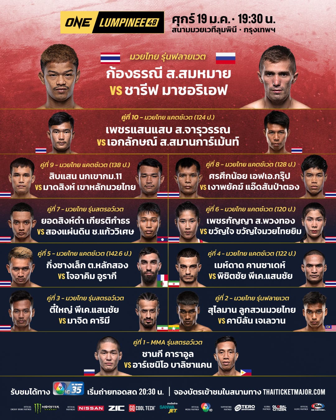 โปรแกรมมวย รายการ ONE Lumpinee 48 ประจำวันศุกร์ที่ 19 มกราคม 2567 เริ่มรายการเวลา 19.30 น. และเริ่มถ่ายทอดสดทางช่อง 7HD เวลา 20.30