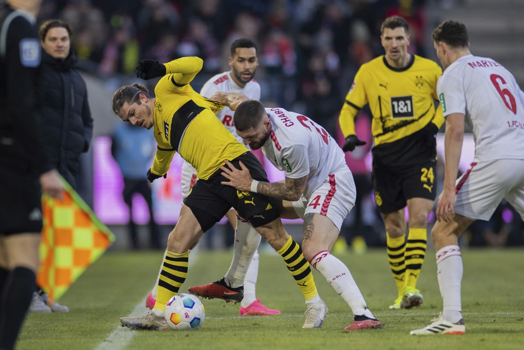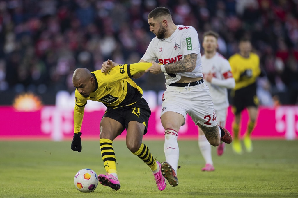 Cologne’s Jeff Chabot reacts, at the end of the German Bundesliga soccer match between Borussia Dortmund and FC Cologne, in Cologne, Germany, Saturday, Jan. 20, 2024. (Rolf Vennenbernd via AP)Dortmund’s Niclas Fullkrug, right, scores a penalty against Cologne goalkeeper Marvin Schwabe, during the German Bundesliga soccer match between Borussia Dortmund and FC Cologne, in Cologne, Germany, Saturday, Jan. 20, 2024. (Rolf Vennenbernd via AP)Cologne’s Jeff Chabot, right and Dortmund’s Donyell Malen vie for the ball, during the German Bundesliga soccer match between Borussia Dortmund and FC Cologne, in Cologne, Germany, Saturday, Jan. 20, 2024. (Rolf Vennenbernd via AP)Cologne’s Jeff Chabot, centre and Dortmund’s Marcel Sabitzer, left vie for the ball, during the German Bundesliga soccer match between Borussia Dortmund and FC Cologne, in Cologne, Germany, Saturday, Jan. 20, 2024. (Rolf Vennenbernd via AP)Dortmund players celebrate Donyell Malen’s goal, during the German Bundesliga soccer match between Borussia Dortmund and FC Cologne, in Cologne, Germany, Saturday, Jan. 20, 2024. (Rolf Vennenbernd via AP)Dortmund’s Donyell Malen celebrates scoring a goal, during the German Bundesliga soccer match between Borussia Dortmund and FC Cologne, in Cologne, Germany, Saturday, Jan. 20, 2024. (Rolf Vennenbernd via AP)