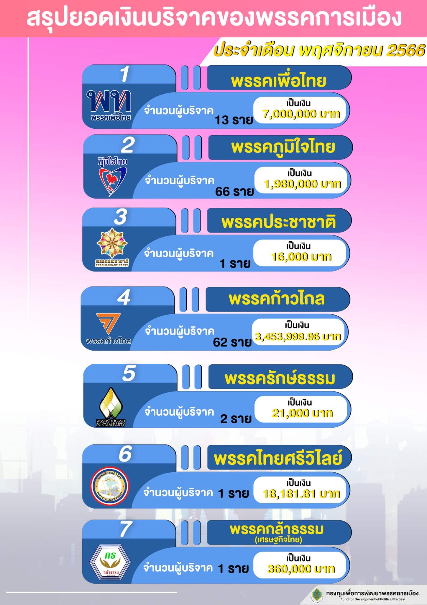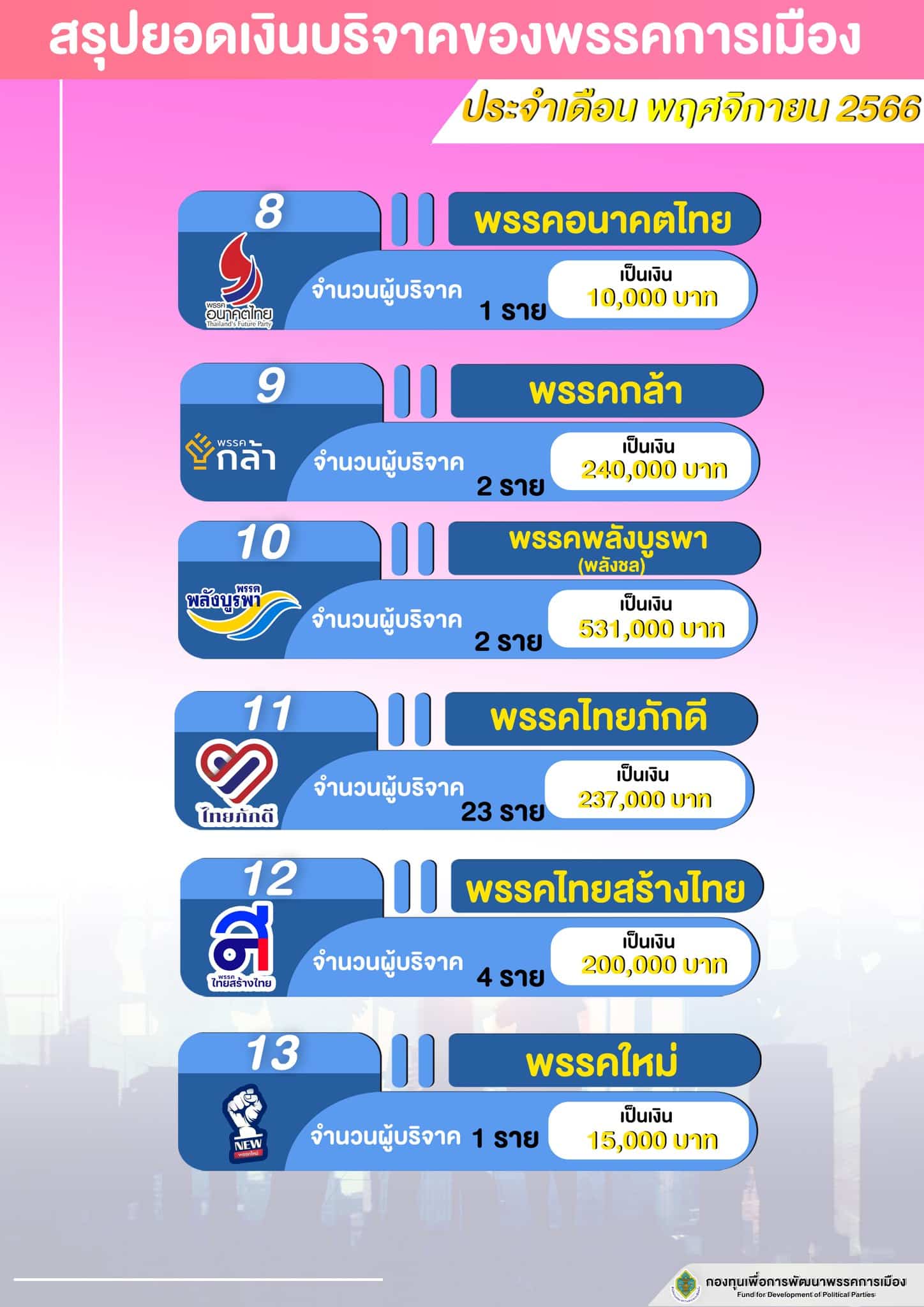 เพจเฟซบุ๊ก กองทุนเพื่อการพัฒนาพรรคการเมืองของ สำนักงานคณะกรรมการการเลือกตั้ง (กกต.) เปิดเผย สรุปยอดเงินบริจาคพรรคการเมืองประจำเดือน พ.ย. 2566 โดยมีพรรคการเมืองที่ได้รับเงินบริจาคทั้งสิ้น 13 พรรค รวมเป็นเงิน 14,082,181 บาท จากผู้บริจาคทั้งสิ้น 179 ราย ประกอบด้วย