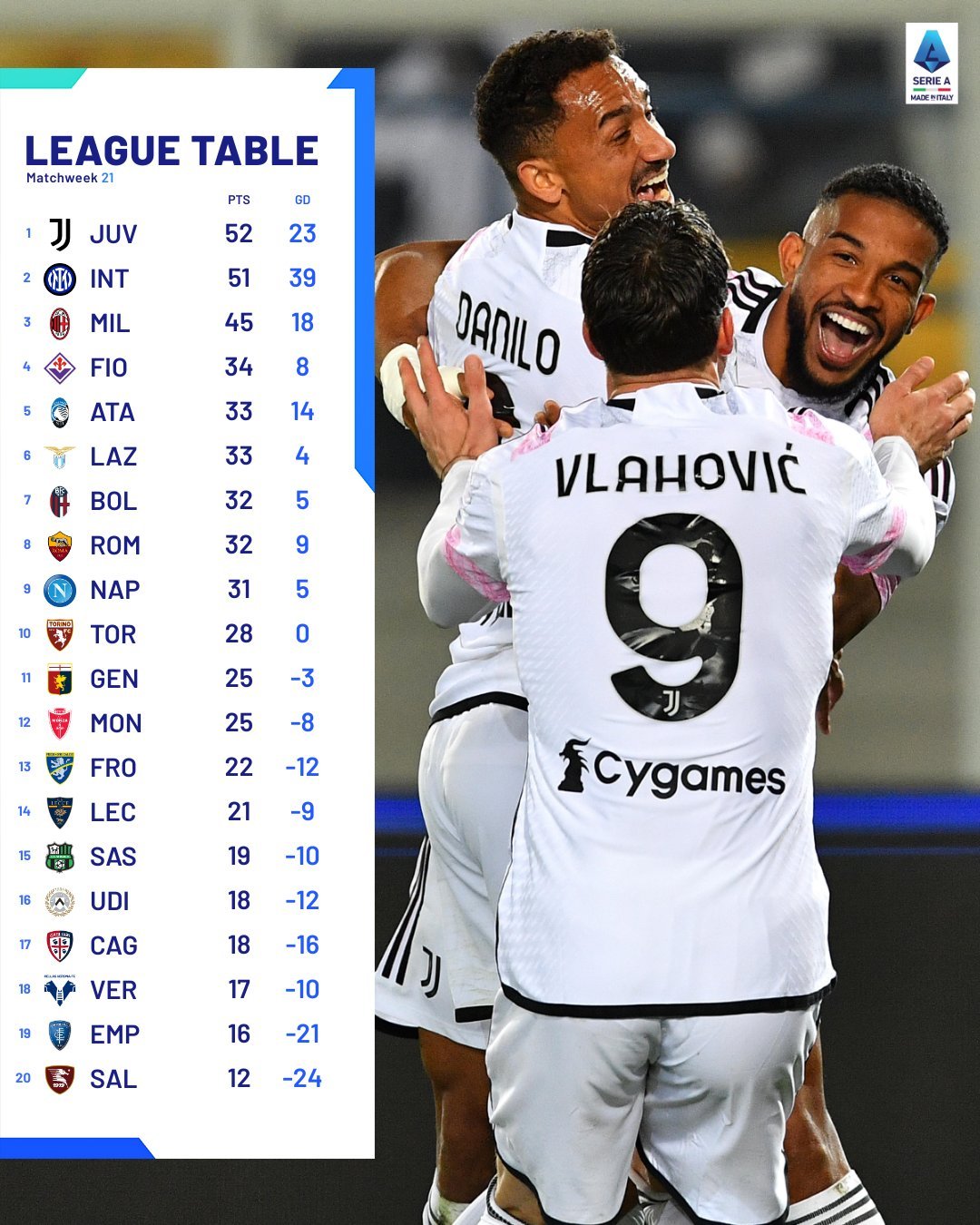 1. ยูเวนตุส แข่ง 21 นัด มี 52 แต้ม