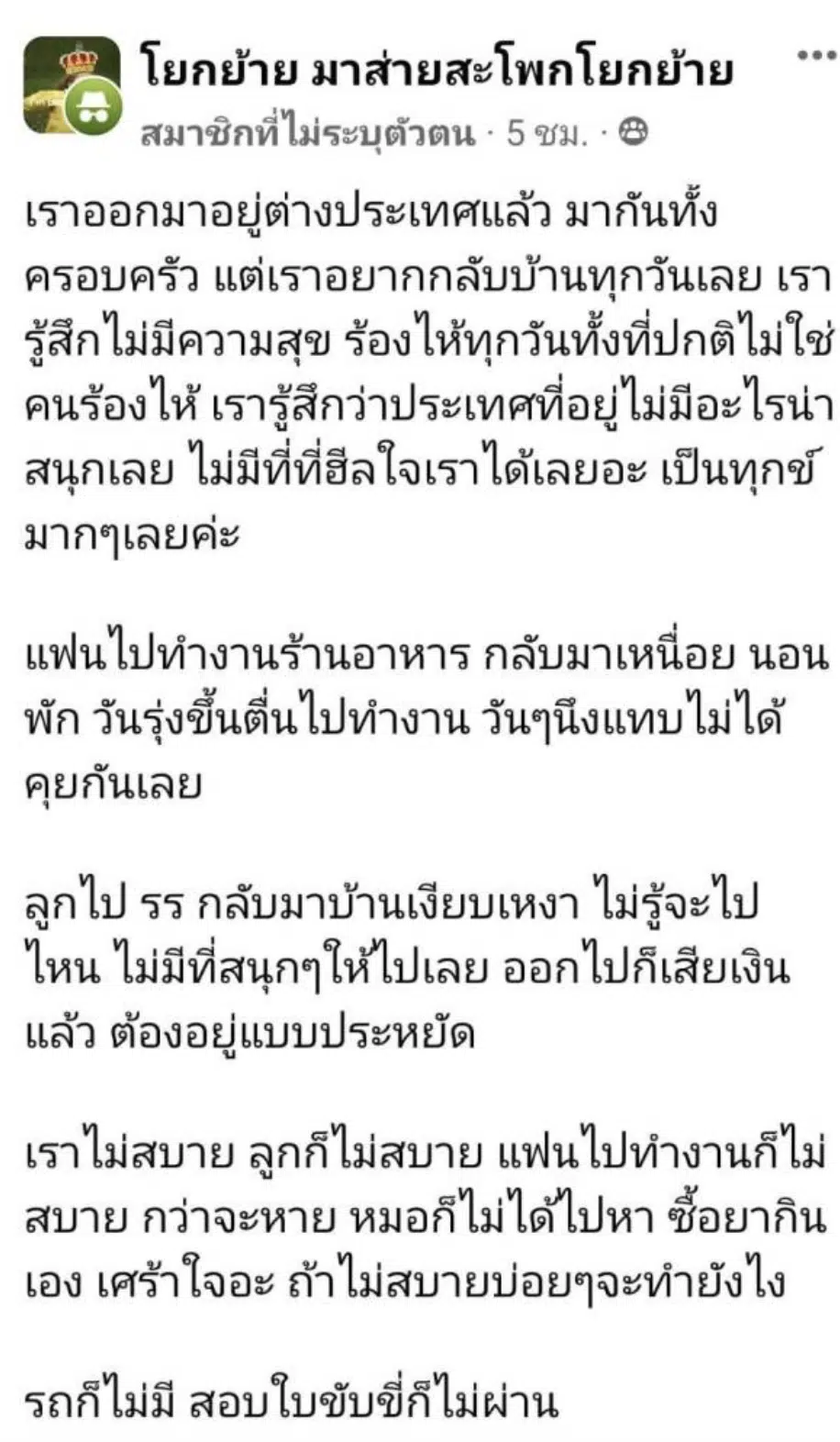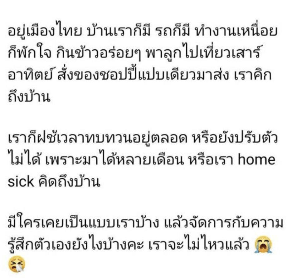 สาวไทย โพสต์ระบายเศร้า ย้ายไปอยู่ต่างประเทศ ไม่มีความสุข ร้องไห้ทุกวัน ป่วยไม่ได้ไปหาหมอ แทบไม่ได้คุยกับสามี อยากกลับเมืองไทย