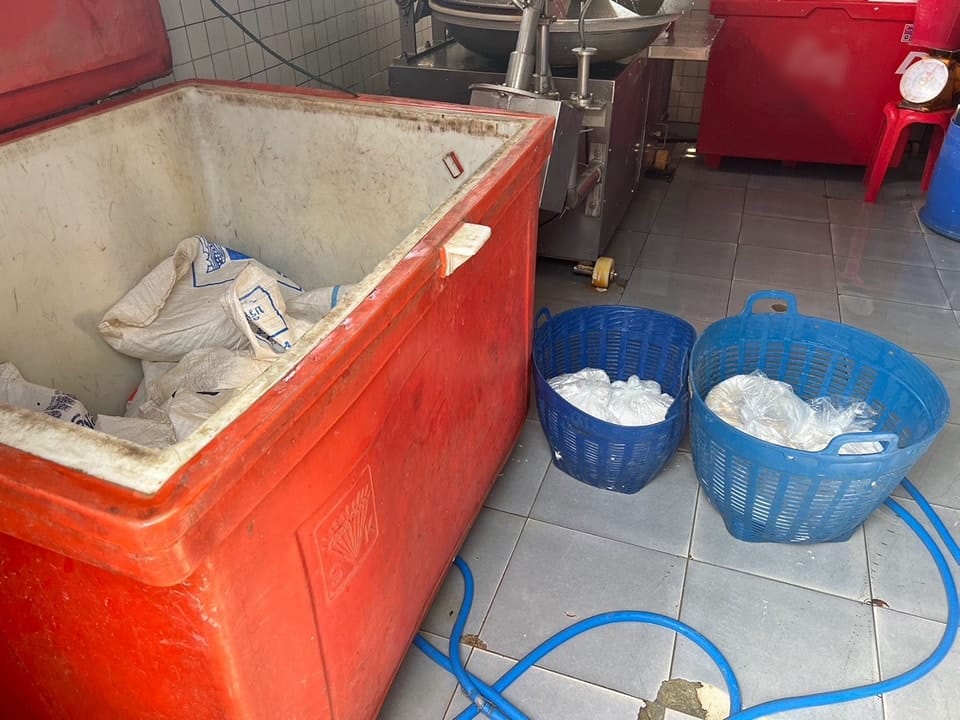 เจ้าของยอมรับรับว่าทำมาแล้ว 1 เดือน ของกลางพบลูกชิ้นบรรจุถุงไม่มียี่ห้อ และลูกชิ้นยี่ห้อต่าง ๆ รวม 7 ยี่ห้อ จำนวนกว่า 2,000 ถุง , ถุงบรรจุภัณฑ์สำหรับใส่ลูกชิ้น จำนวน 1,800 ใบ , เนื้อไก่ 10 กิโลกรัม จำนวน 20 ถุง , มันหมู 3 กิโลกรัม จำนวน 50 ถุง เครื่องบด จำนวน 1 เครื่อง , เครื่องตีผสม จำนวน 1 เครื่อง , เครื่องปั้นลูกชิ้น จำนวน 2 เครื่อง , หม้อต้มลูกชิ้น จำนวน 2 ใบ และอุปกรณ์ในการผลิตลูกชิ้นพร้อมส่วนผสมต่าง ๆ