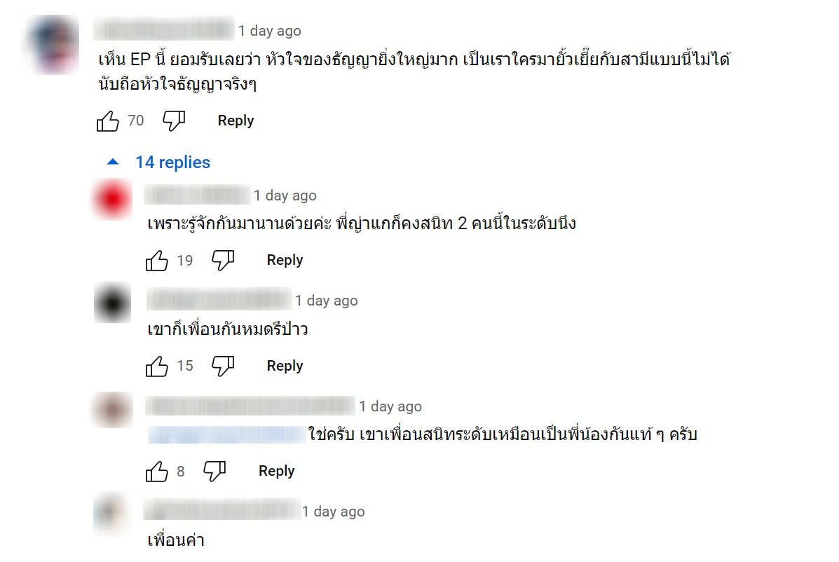 ด้านคอมเมนต์ใต้คลิปส่วนใหญ่ชอบใหญ่ในความสนิทกันของทั้งสามคน ขณะเดียวกันมีคนเข้ามาคอมเมนต์เชิงเห็นใจธัญญ่า ภรรยาของหนุ่มเป็ก ว่า “เห็น EP นี้ ยอมรับเลยว่า หัวในของธัญญ่า (ธัญญาเรศ เองตระกูล) ยิ่งใหญ่มาก เป็นเราใครมายั้วเยี้ยกับสามีแบบนี้ไม่ได้”