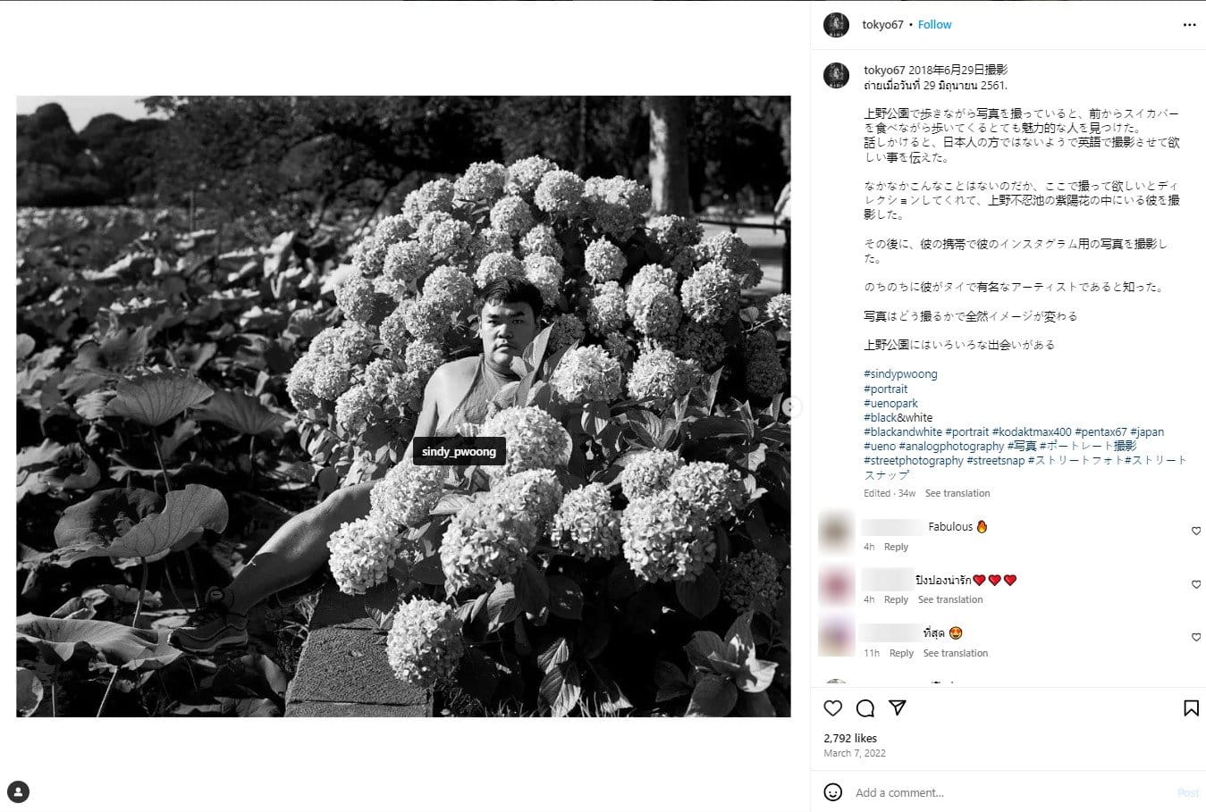 “พอลองบอกแบบที่อยากถ่ายไปเขาก็ลงไปอยู่ท่ามกลางดอกไม้ให้ผมถ่าย ปกติไม่ค่อยมีใครลงไปถ่ายรูปกับดอกไม้อะไรในแบบนี้นะ หลังจากนั้นเขาก็เปิดไอจีในมือถือเขาให้ดู แล้วก็ถ่ายรูปในแบบไอจีของเขากัน แล้วผมก็เลยได้มารู้ว่าเขาเป็นศิลปินคนดังในประเทศไทย รูปภาพสามารถเปลี่ยนไปได้ในแบบต่างๆ ด้วยวิธีการถ่ายภาพ ผมได้พบเจอคนมากมายในสวนอุเอโนะ”