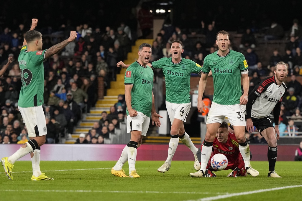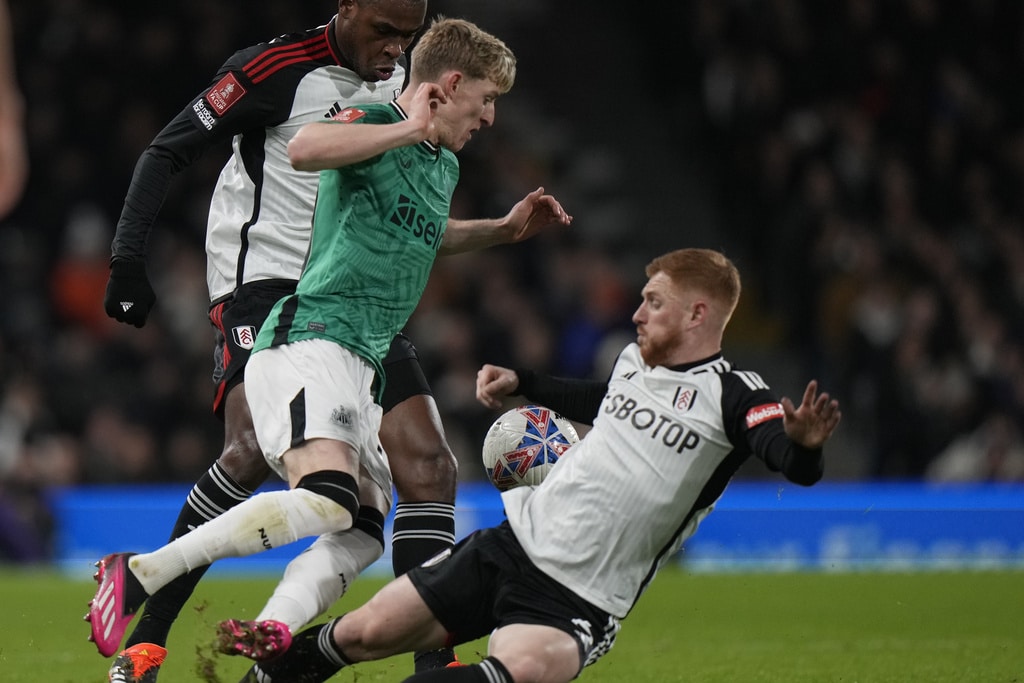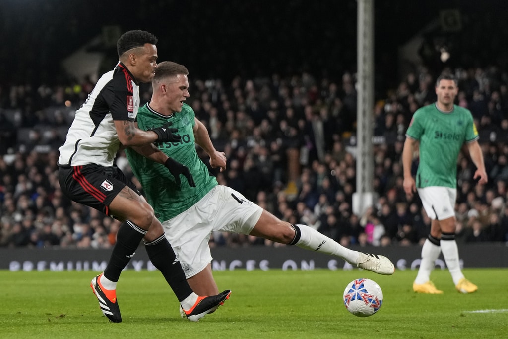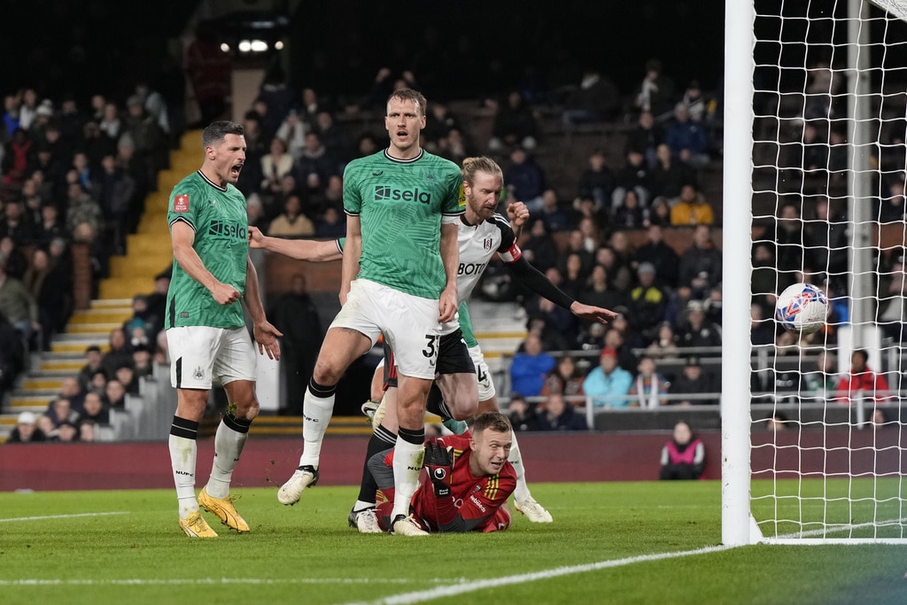 Newcastle’s Anthony Gordon, left, is challenged by Fulham’s Harrison Reed during the English FA Cup fourth round soccer match between Fulham and Newcastle United at Craven Cottage stadium in London, Saturday, Jan. 27, 2024. (AP Photo/Alastair Grant)Newcastle’s Dan Burn, right, celebrates after scoring his side’s second goal during the English FA Cup fourth round soccer match between Fulham and Newcastle United at Craven Cottage stadium in London, Saturday, Jan. 27, 2024. (AP Photo/Alastair Grant)Newcastle’s Dan Burn, right, celebrates after scoring his side’s second goal during the English FA Cup fourth round soccer match between Fulham and Newcastle United at Craven Cottage stadium in London, Saturday, Jan. 27, 2024. (AP Photo/Alastair Grant)Newcastle’s Jacob Murphy, center right, is challenged by Fulham’s Antonee Robinson during the English FA Cup fourth round soccer match between Fulham and Newcastle United at Craven Cottage stadium in London, Saturday, Jan. 27, 2024. (AP Photo/Alastair Grant)Fulham’s Kenny Tete, left, attempts a shot at goal in front of Newcastle’s Elliot Anderson during the English FA Cup fourth round soccer match between Fulham and Newcastle United at Craven Cottage stadium in London, Saturday, Jan. 27, 2024. (AP Photo/Alastair Grant)Newcastle’s head coach Eddie Howe, right, gives instructions from the side line during the English FA Cup fourth round soccer match between Fulham and Newcastle United at Craven Cottage stadium in London, Saturday, Jan. 27, 2024. (AP Photo/Alastair Grant)Newcastle’s Sven Botman, bottom, is challenged by Fulham’s Harrison Reed during the English FA Cup fourth round soccer match between Fulham and Newcastle United at Craven Cottage stadium in London, Saturday, Jan. 27, 2024. (AP Photo/Alastair Grant)Fulham’s Rodrigo Muniz, left, attempts a shot at goal in front of Newcastle’s Fabian Schaer during the English FA Cup fourth round soccer match between Fulham and Newcastle United at Craven Cottage stadium in London, Saturday, Jan. 27, 2024. (AP Photo/Alastair Grant)Fulham’s Rodrigo Muniz, left, fights for the ball with Newcastle’s Sven Botman during the English FA Cup fourth round soccer match between Fulham and Newcastle United at Craven Cottage stadium in London, Saturday, Jan. 27, 2024. (AP Photo/Alastair Grant)