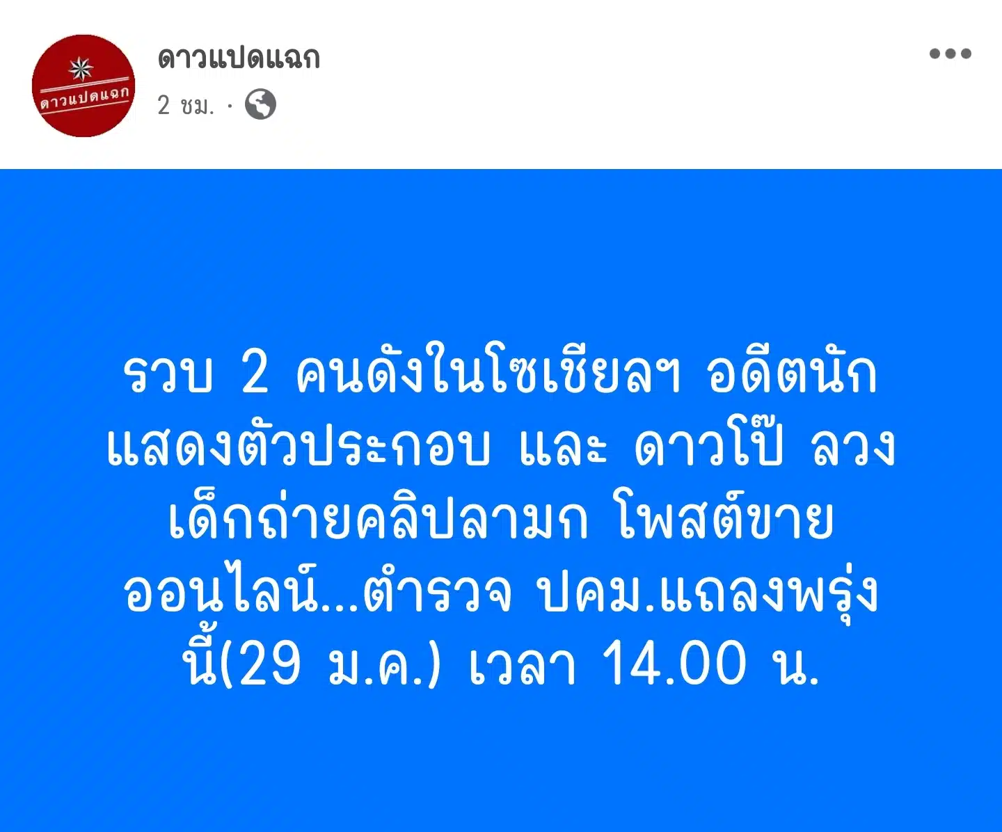 “รวบ 2 คนดังในโซเชียลฯ อดีตนัก แสดงตัวประกอบ และ ดาวโป๊ ลวงเด็กถ่ายคลิปลามก โพสต์ขาย ออนไลน์…ตำรวจ ปคม.แถลงพรุ่ง นี้ (29 มกราคม) เวลา 14.00 น.”