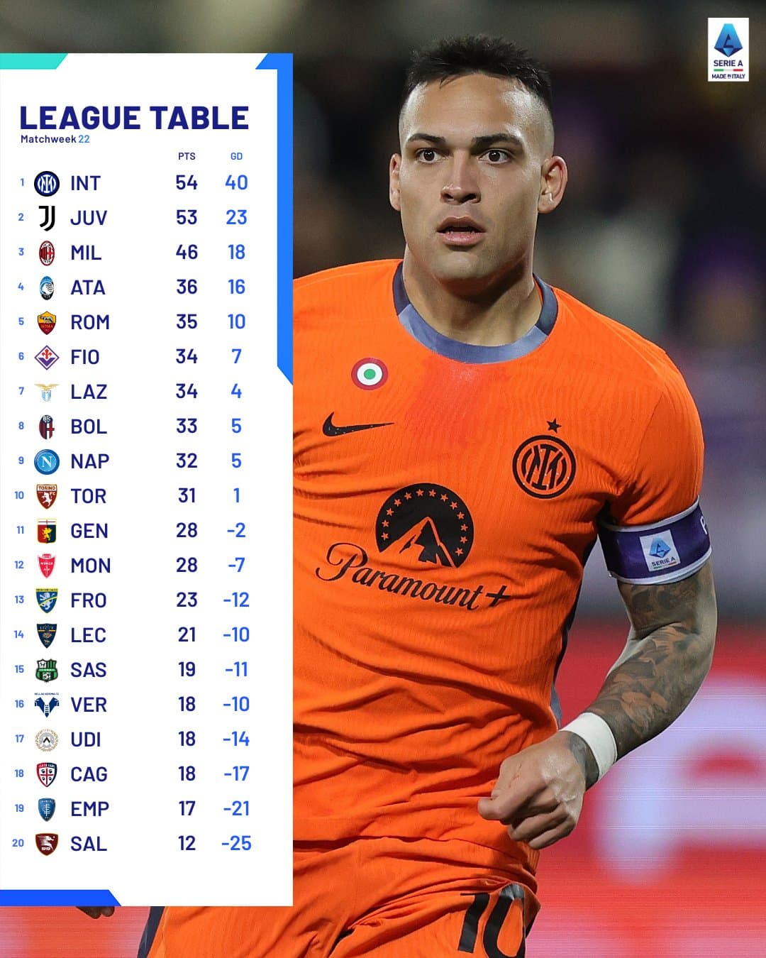 1. อินเตอร์ มิลาน แข่ง 21 นัด มี 54 แต้ม