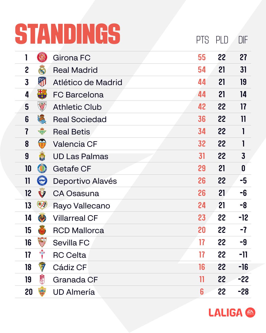อันดับ ตารางคะแนน ลาลีกา สเปน 2023/24 หลังจบแมตซ์เดย์ที่ 22 โดย 5 อันดับเป็นไปตามลำดับมีดังนี้ (อัปเดตวันที่ 30 มกราคม 2567)