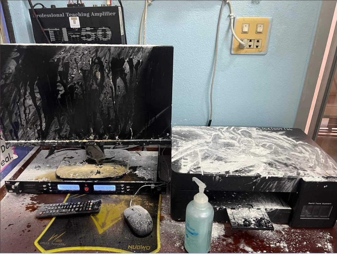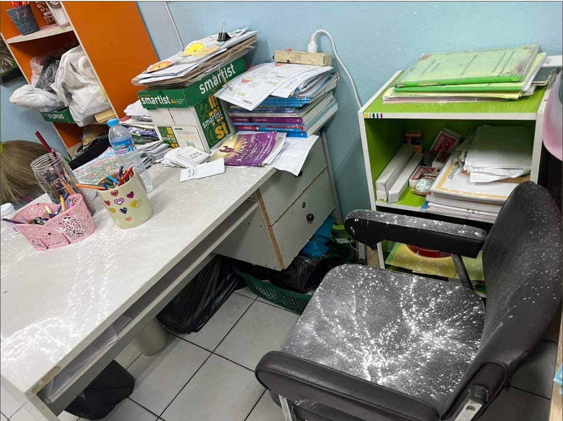 ข้าวของของโรงเรียนเสียหายมาก คอมพิวเตอร์โดนตัดสาย เอาค้อนทุบจอแตกหมดทุกเครื่อง เครื่องปริ้นก็เอากาวเท รวมทั้งโต๊ะครูด้วย สมุด หนังสือเรียนโดนเผา