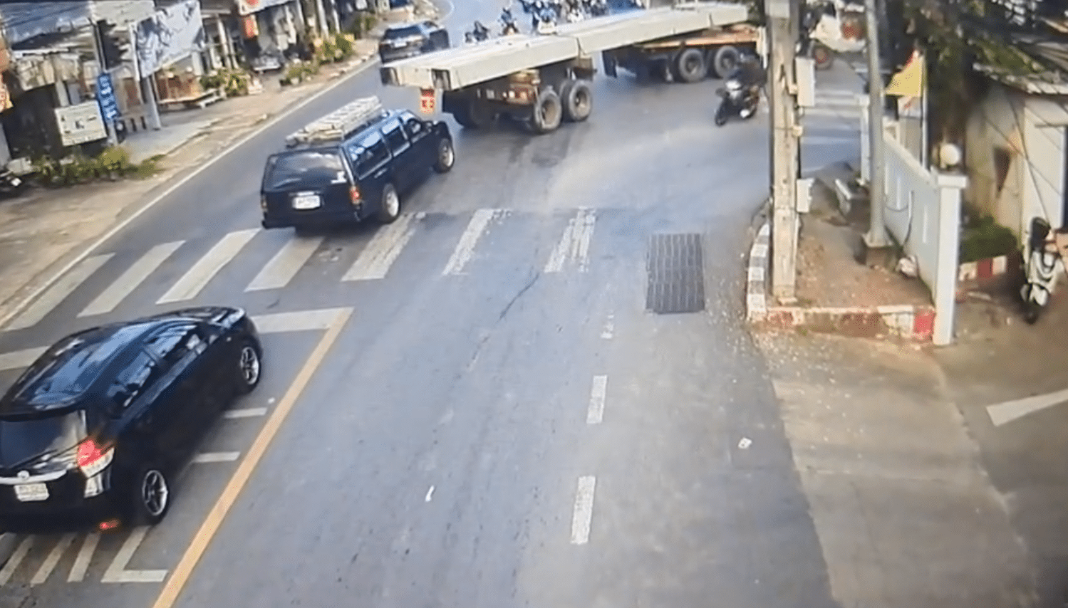 อย่างในคลิป เผยให้เห็นวินัยจราจรของคนไทยผู้ขับขี่รถยนจักรยานยนต์ที่น่ากลัวอย่างถึงขีดสุด รถบรรทุกพ่วง 18 ล้อ ที่ขนเสาปูนยาวมาด้วย ได้เลี้ยวขวา และติดอยู่กลางแยก ขณะที่ทางตรงถึงช่วงของไฟเขียว